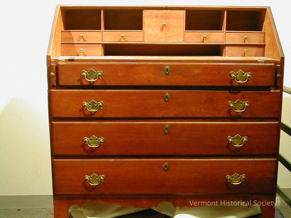 Drop-front desk with missing drop front. The desk has four drawers, each with two brass batwing pulls and oval keyhole escutcheons. The interior of the desk has four pigeon holes and seven small drawers. Inside one of the drawers is written, "&79.70 Gold or Silver / C. W. Jackson / Nov. 6th 1817 / Fall Term".