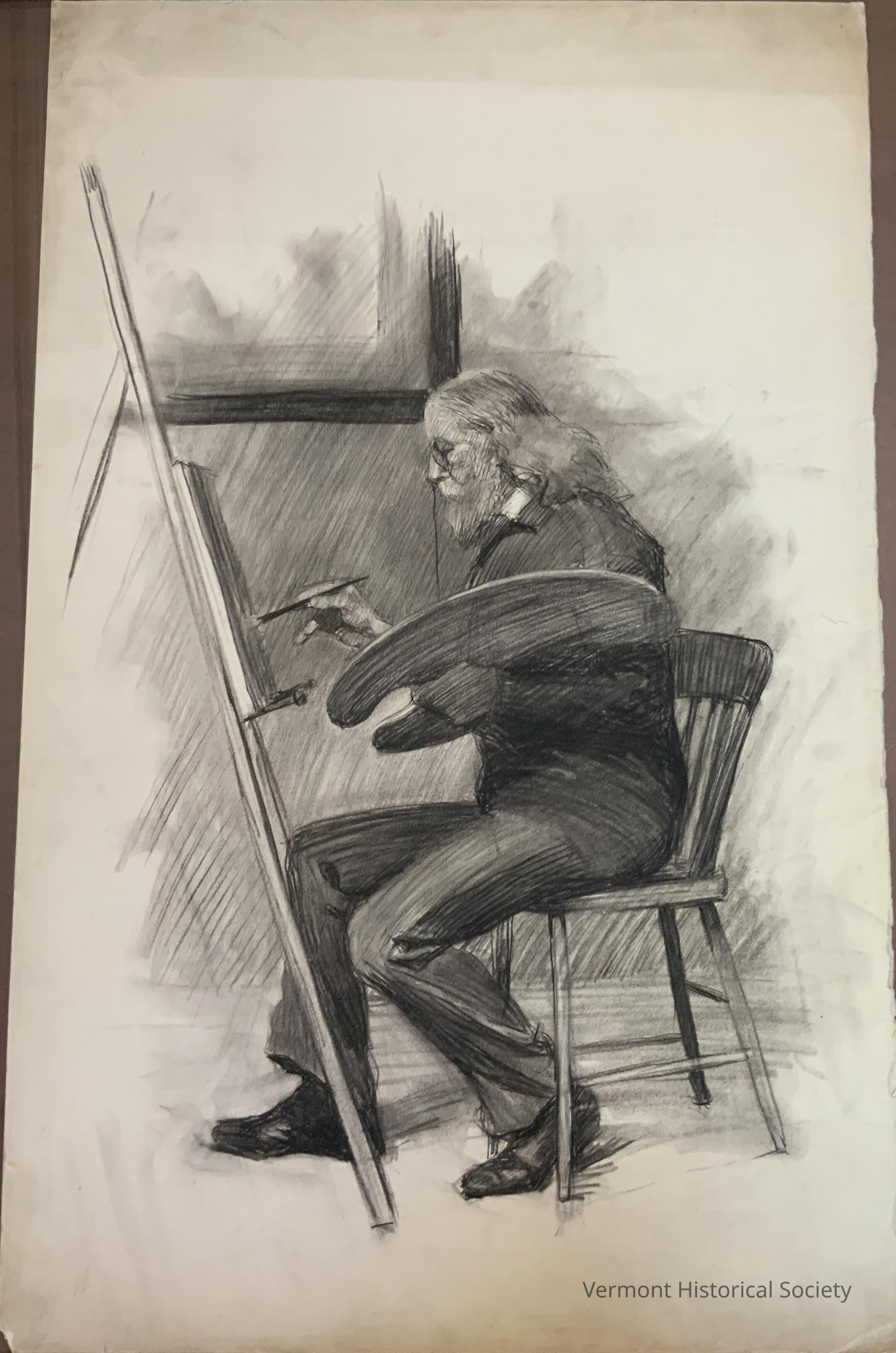 A drawing of a man in profile painting at an easel. He had long hair and a beard and wears glasses.Type of Drawing