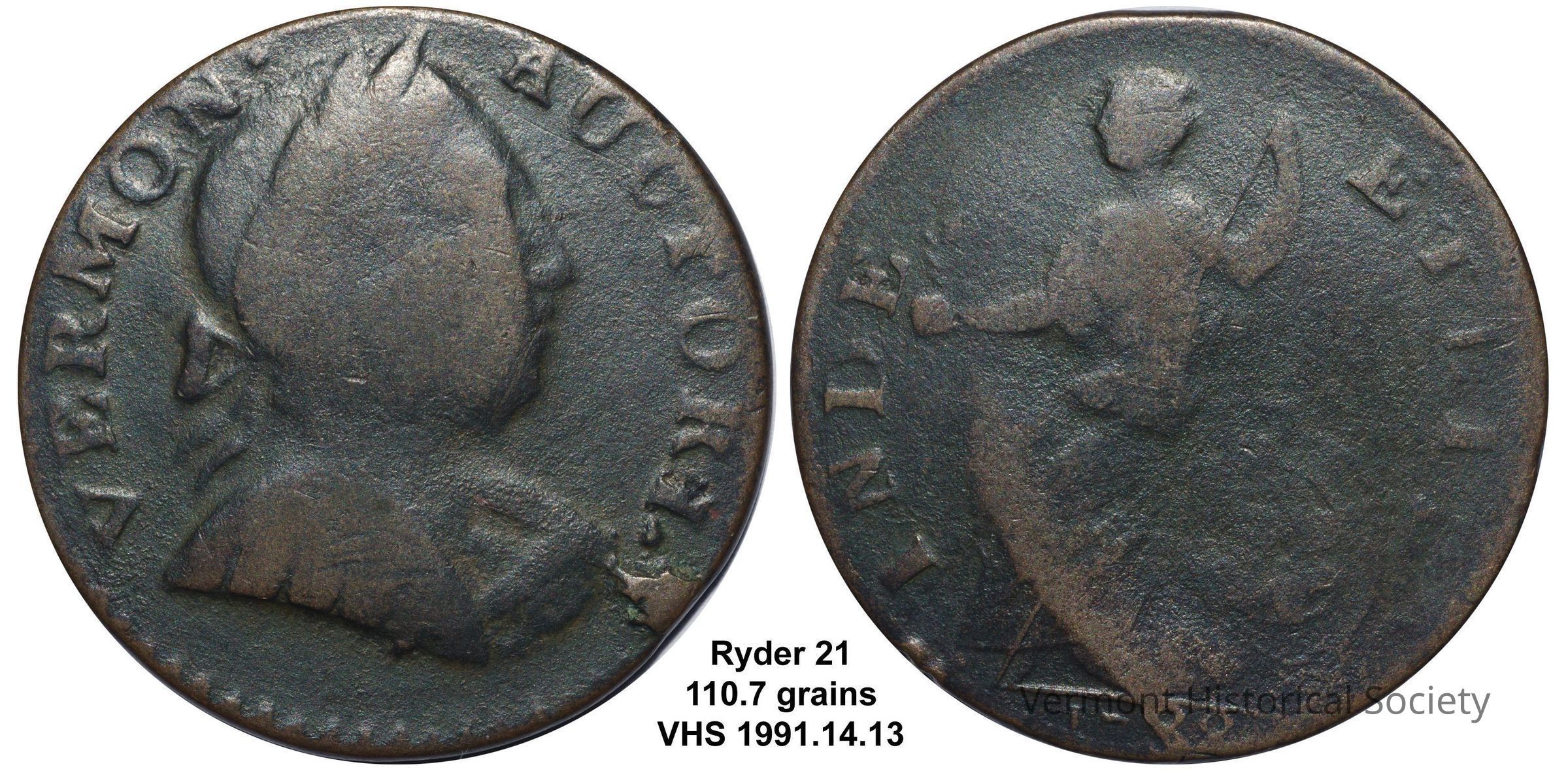 Copper coin with a bust on one side and the allegorical figure, Columbia, on the other. The face side shows a right-facing bust of a Roman figure, wearing a laurel wreath on his head, tied with a ribbon at the nape of his neck, and military armor. The words "VERMON AUCTORI" ring the edge. On the reverse, Columbia is shown swathed in loose fabric, seated next to a shield bearing the Union flag. She is holding a staff with a liberty cap in her left hand, and a small branch in her right hand. The words "INDE ET LIB 1788" ring the edge.Context