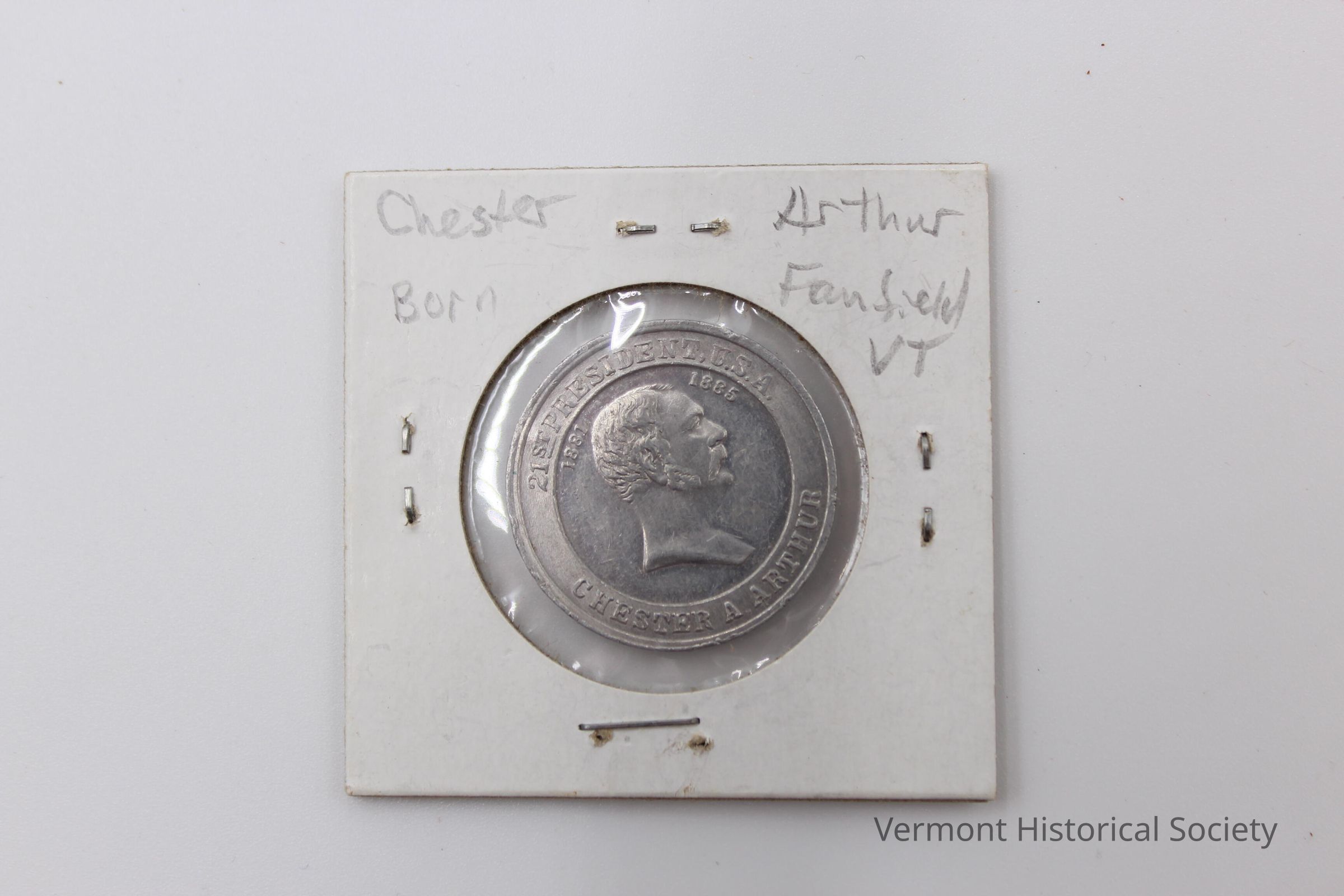 Silver-toned medal commemorating the two terms of Chester A. Arthur as President of the United States. The face shows a profile image of Arthur with the words, "21ST PRESIDENT, U.S.A./1881 1885/CHESTER A. ARTHUR." The reverse shows the words '"OUR CHET"/"FIRST GENTLEMAN OF THE LAND"' around the outer edge and "JOIN/CRACKER JACK/MYSTERY CLUB/SAVE THIS COIN/THE CRACKER JACK CO./CHICAGO./U.S.A." in the center.