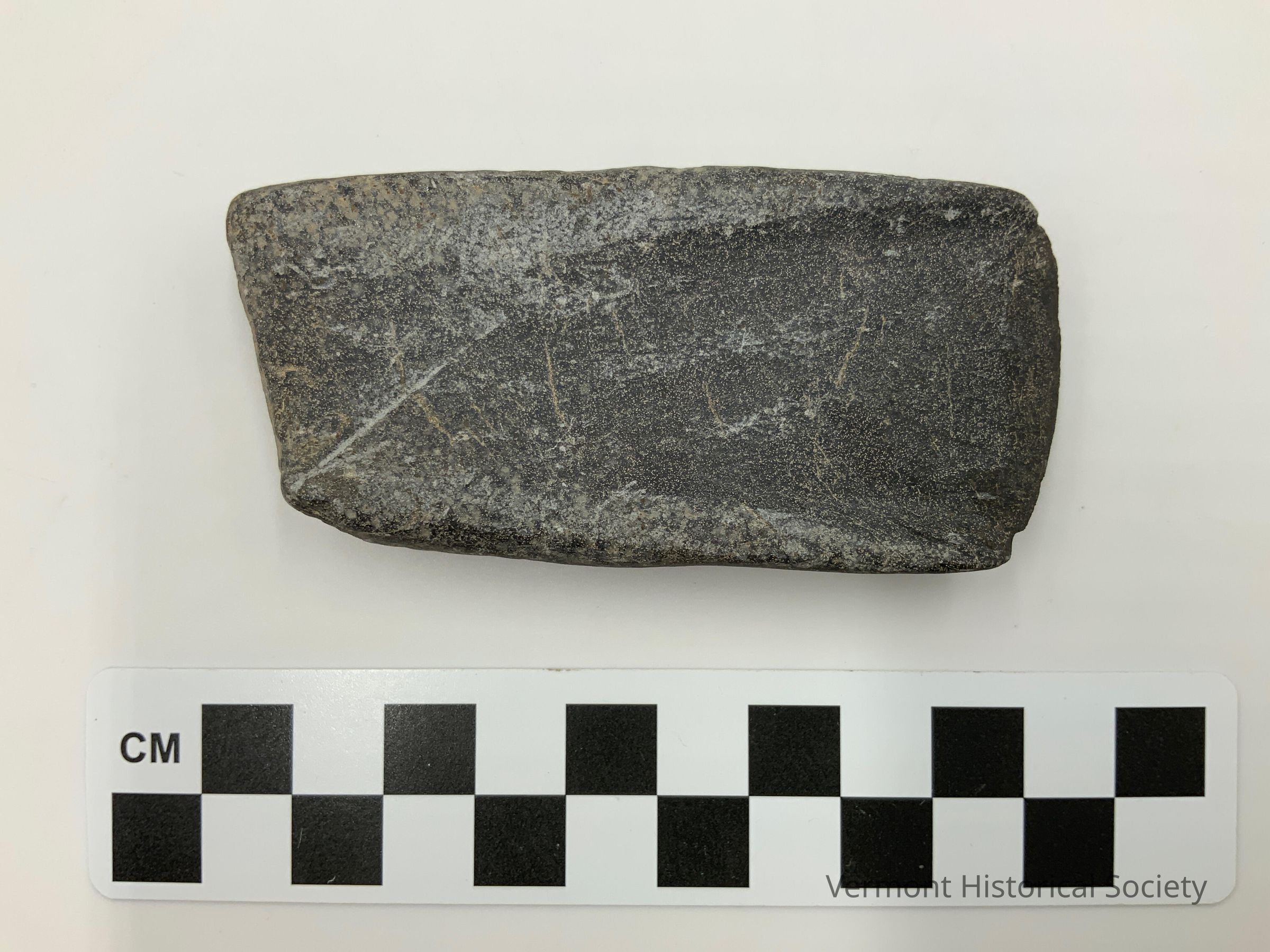 Ground stone gouge made of hornfels. It has a pecked surface. The proximal end is flat and at an angle. The distal end is ground and polished to a sharp blade. There is a groove along one side that is ground and polished.Context