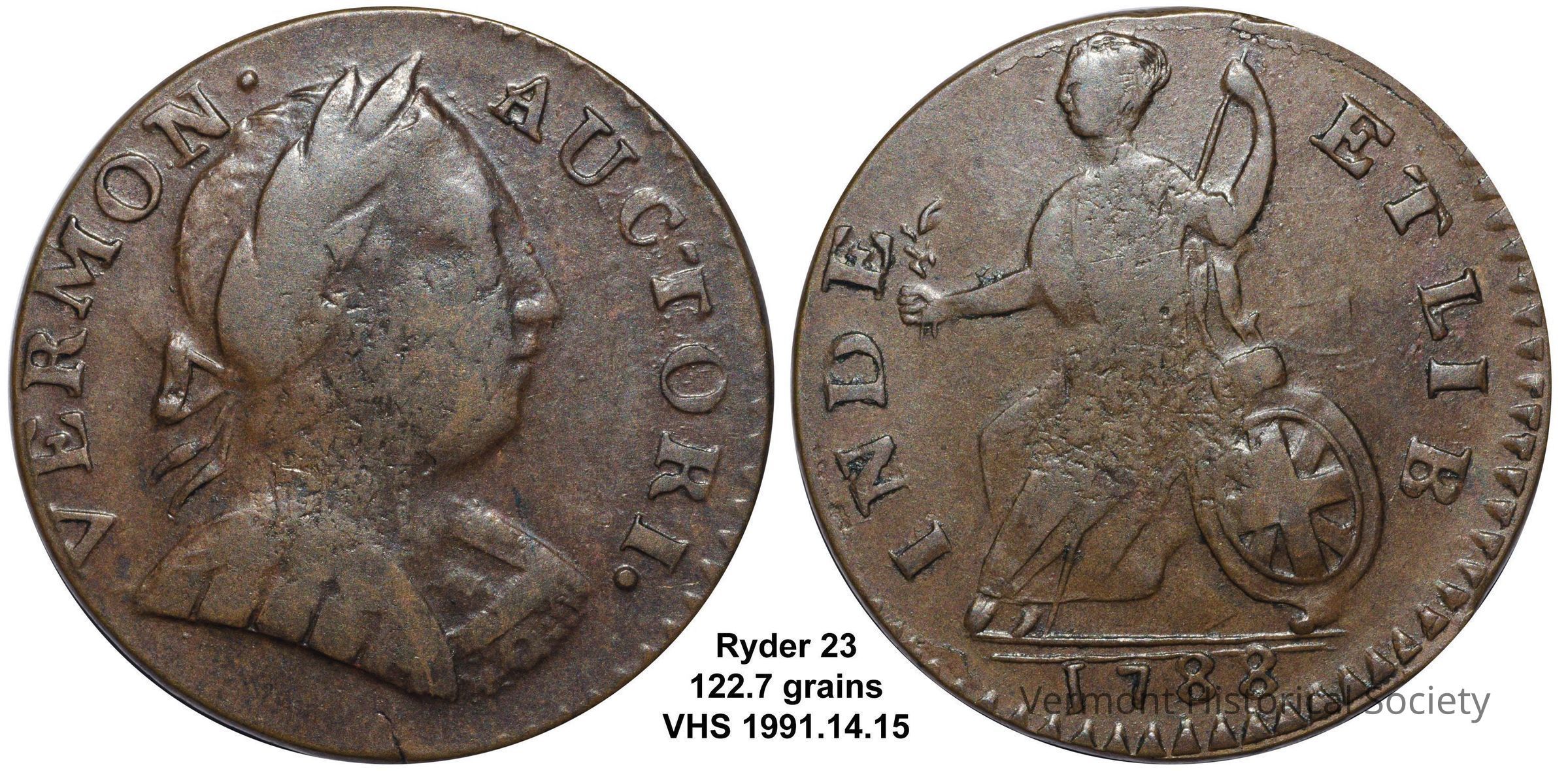 Copper coin with a bust on one side and the allegorical figure, Columbia, on the other. The face side shows a right-facing bust of a Roman figure, wearing a laurel wreath on his head, tied with a ribbon at the nape of his neck, and military armor. The words "VERMON AUCTORI" ring the edge. On the reverse, Columbia is shown swathed in loose fabric, seated next to a shield bearing the Union flag. She is holding a staff with a liberty cap in her left hand, and a small branch in her right hand. The words "INDE ET LIB 1788" ring the edge.Context
