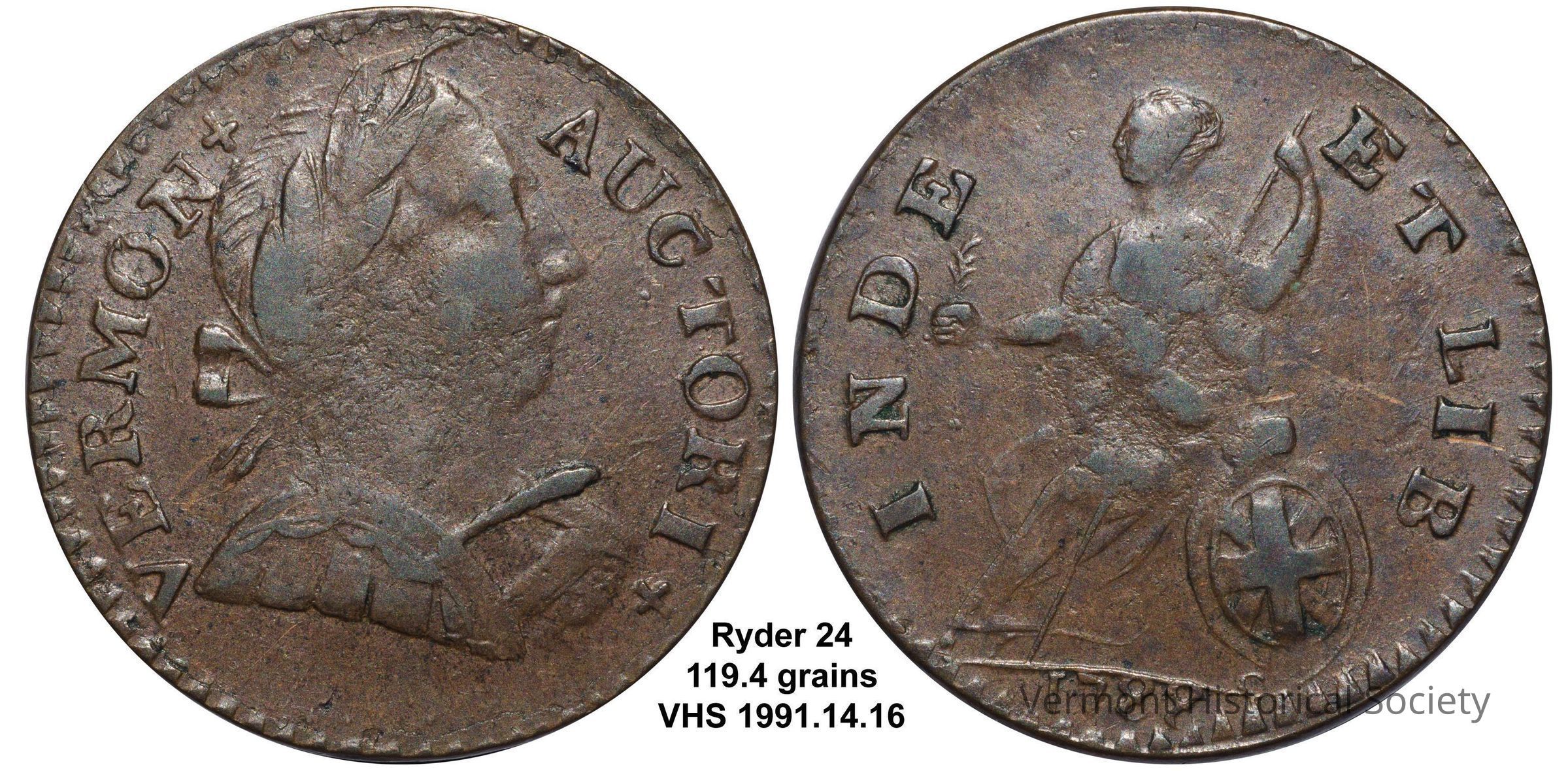 Copper coin with a bust on one side and the allegorical figure, Columbia, on the other. The face side shows a right-facing bust of a Roman figure, wearing a laurel wreath on his head, tied with a ribbon at the nape of his neck, and military armor. The words "VERMON AUCTORI" ring the edge. On the reverse, Columbia is shown swathed in loose fabric, seated next to a shield bearing the Union flag. She is holding a staff with a liberty cap in her left hand, and a small branch in her right hand. The words "INDE ET LIB 1788" ring the edge.Context