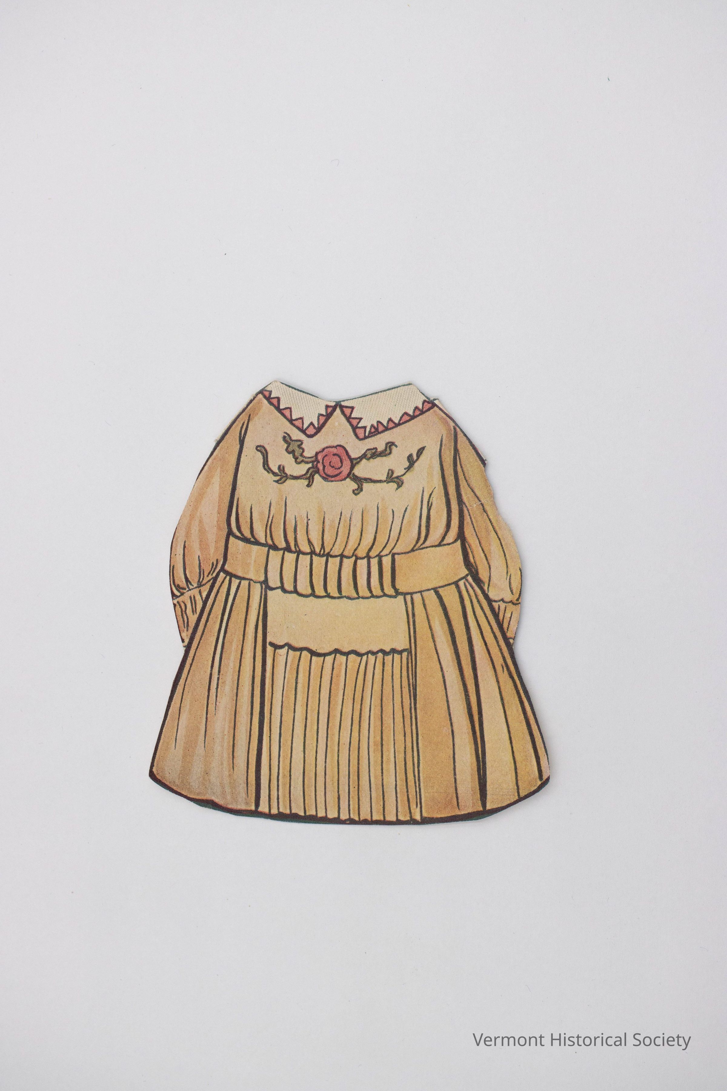 Printed paper dress for a paper doll. The dress is orange with a pink rose at the center front bust. The back shows a portion of a sales catalog page and the handwritten label, "Leota".Context