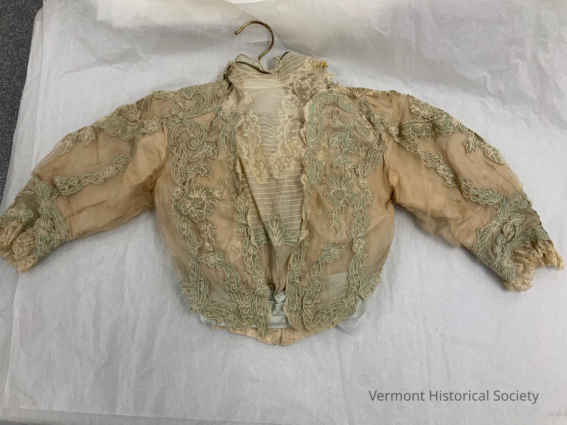 This two-piece dress consists of a bodice and skirt of cream-colored silk with a net overlay. The net overlay is decorated with delicate light blue appliquéd flowers, leaves, and swirls. Each piece is edged with a solid white satin stitch. The bodice has a high net collar, edged with lace, and elbow-length sleeves also edged with lace. A blue ribbon is sewn around the waist beneath the netting, similar to a cumber bund. The skirt of the dress is floor length with a very slight train and composed of white net layered over white silk, with the same blue appliqué adorning the net overlay. The bodice interior is boned, and there is an elastic waist strap woven with the label, "Sullivan / RUTLAND, VT."Context
