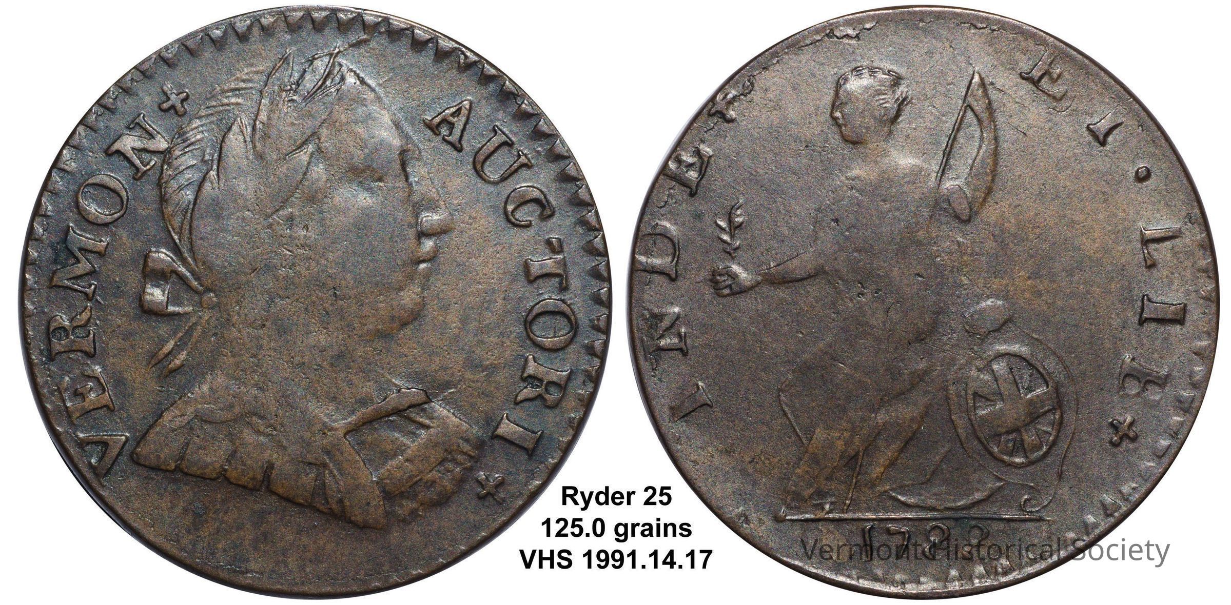 Copper coin with a bust on one side and the allegorical figure, Columbia, on the other. The face side shows a right-facing bust of a Roman figure, wearing a laurel wreath on his head, tied with a ribbon at the nape of his neck, and military armor. The words "VERMON AUCTORI" ring the edge. On the reverse, Columbia is shown swathed in loose fabric, seated next to a shield bearing the Union flag. She is holding a staff with a liberty cap in her left hand, and a small branch in her right hand. The words "INDE ET LIB 1788" ring the edge.Context