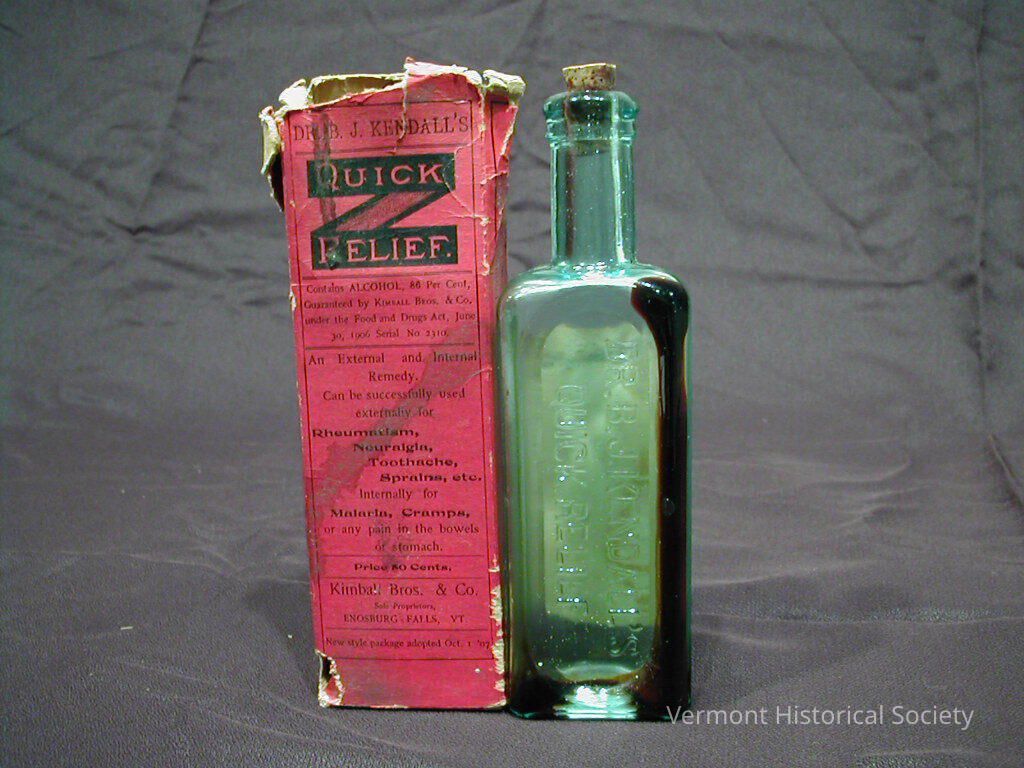 Rectangular green glass medicine bottle with a red cardboard box. The bottle has the molded inscription, "DR. B. J. KENDALL'S QUICK RELIEF" on one side and a paper label on the other side. The box is also labeled for Dr. B. J. Kendall's Quick Relief and lists the ingredients and uses.