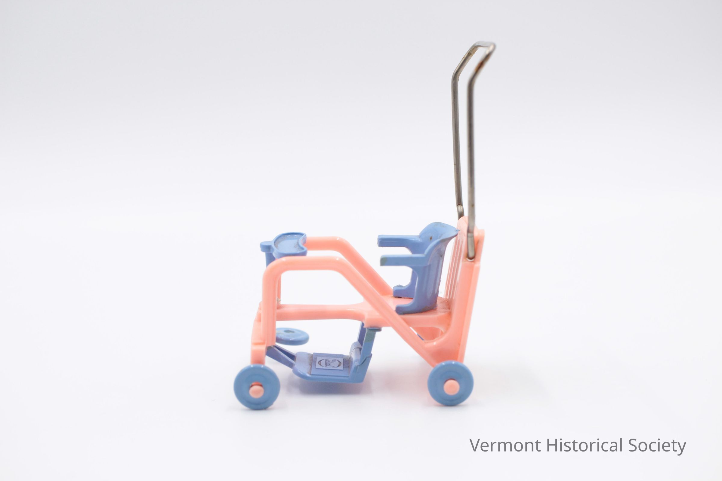 Miniature stroller sized for a dollhouse. The body of the stroller is made of plastic, with a pink frame and blue tray, seatback, wheels, and footwell. There is a metal wire handle that folds over the front or hinges up to push.Context