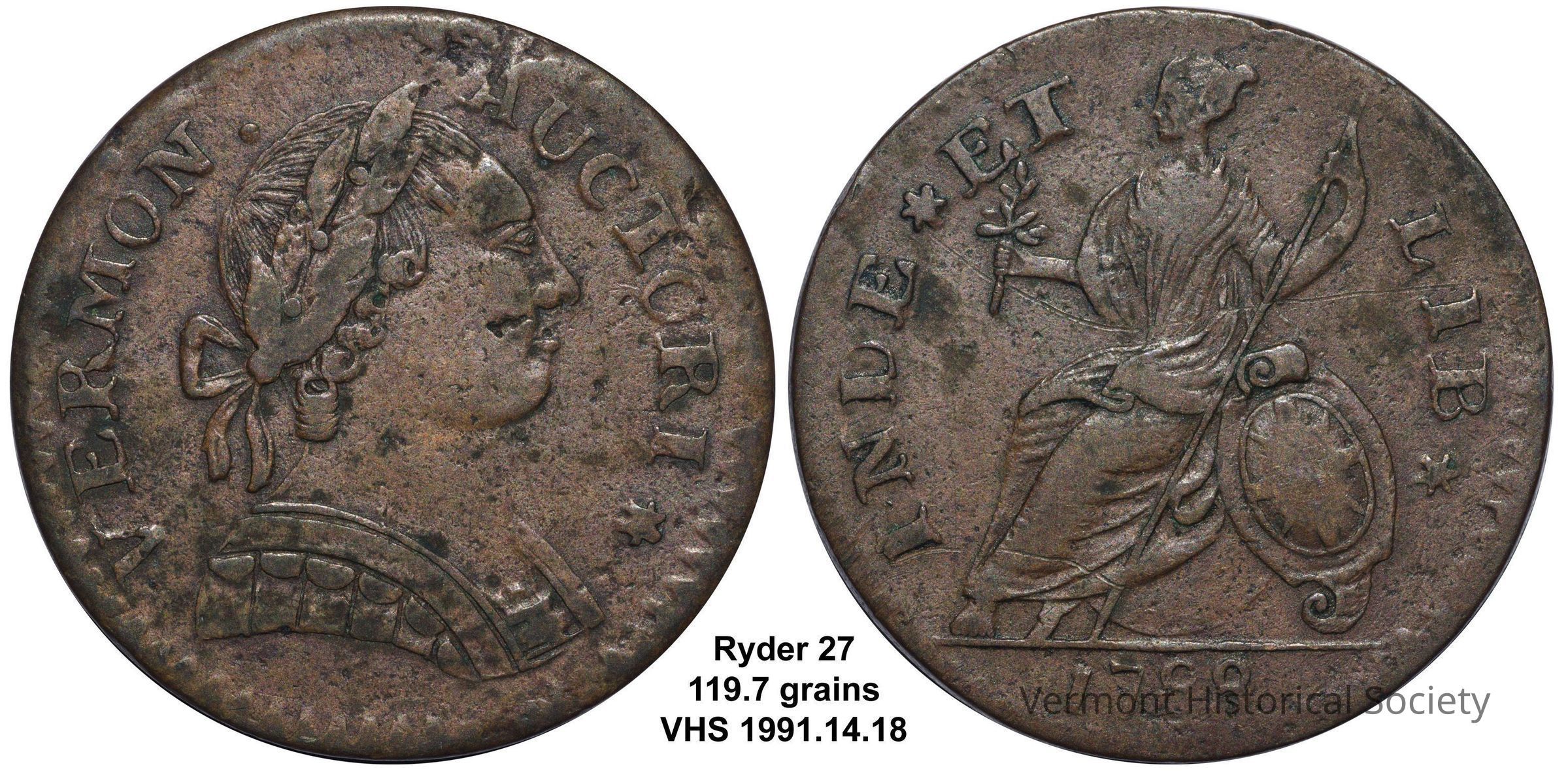 Copper coin with a bust on one side and the allegorical figure, Columbia, on the other. The face side shows a right-facing bust of a Roman figure, wearing a laurel wreath on his head, tied with a ribbon at the nape of his neck, and military armor. The words "VERMON AUCTORI" ring the edge. On the reverse, Columbia is shown swathed in loose fabric, seated next to a shield bearing the Union flag. She is holding a staff with a liberty cap in her left hand, and a small branch in her right hand. The words "INDE ET LIB 1788" ring the edge.Context