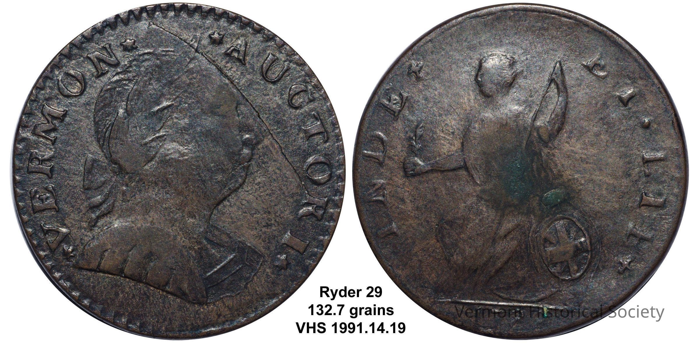 Copper coin with a bust on one side and the allegorical figure, Columbia, on the other. The face side shows a right-facing bust of a Roman figure, wearing a laurel wreath on his head, tied with a ribbon at the nape of his neck, and military armor. The words "VERMON AUCTORI" ring the edge. On the reverse, Columbia is shown swathed in loose fabric, seated next to a shield bearing the Union flag. She is holding a staff with a liberty cap in her left hand, and a small branch in her right hand. The words "INDE ET LIB 1788" ring the edge.Context