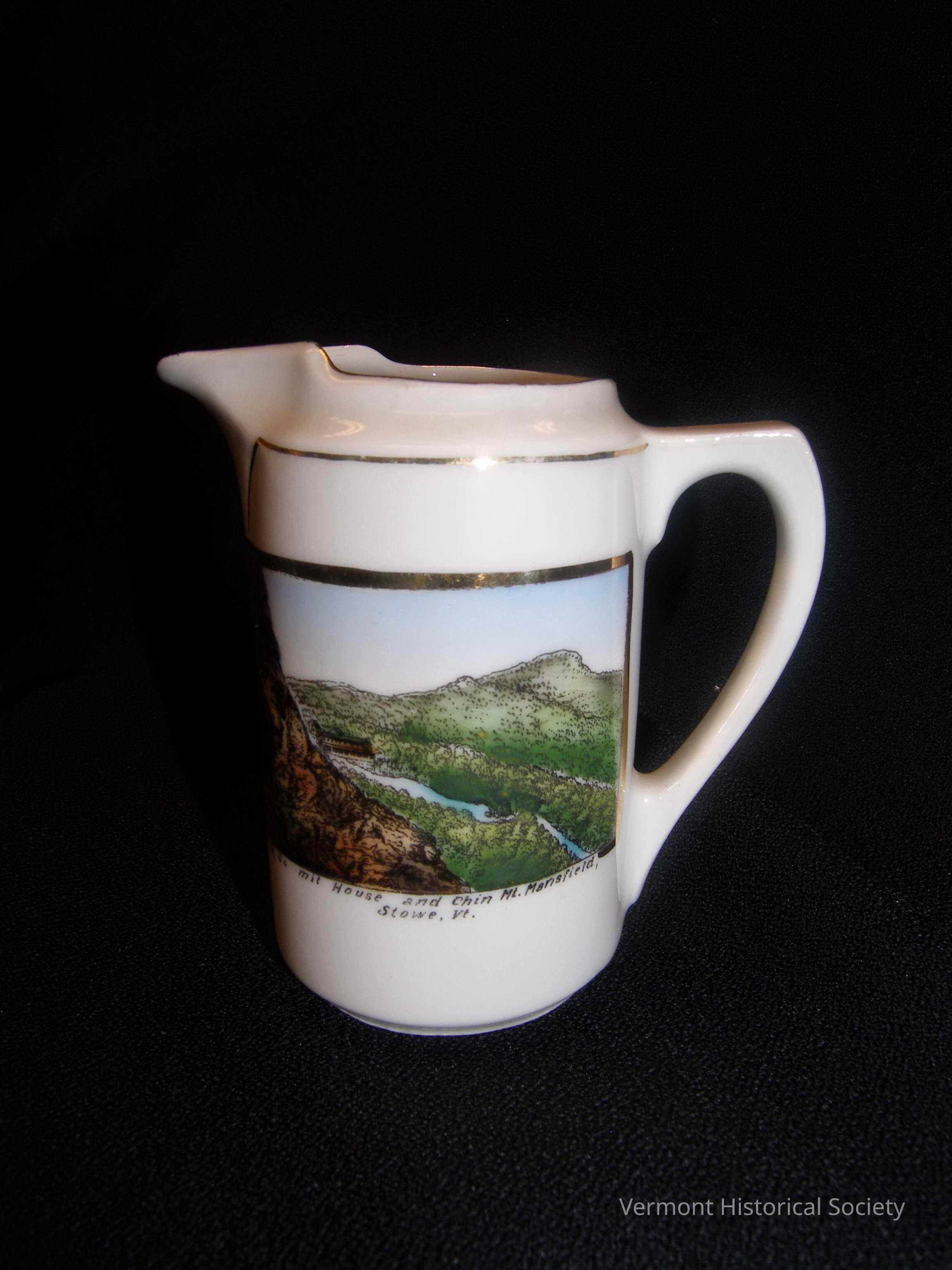 White ceramic cream pitcher printed with a full-color illustration of a an aerial view of a river running through a valley. A rocky cliff rises in the foreground at the left of the image. The image is labeled, "Nose, Summit House and Chin, Mt. Mansfield, Stowe, Vt." The bottom of the pitcher is marked, "Made in Germany for Mt. Mansfield Hotel Co., Stowe, Vermont".Context