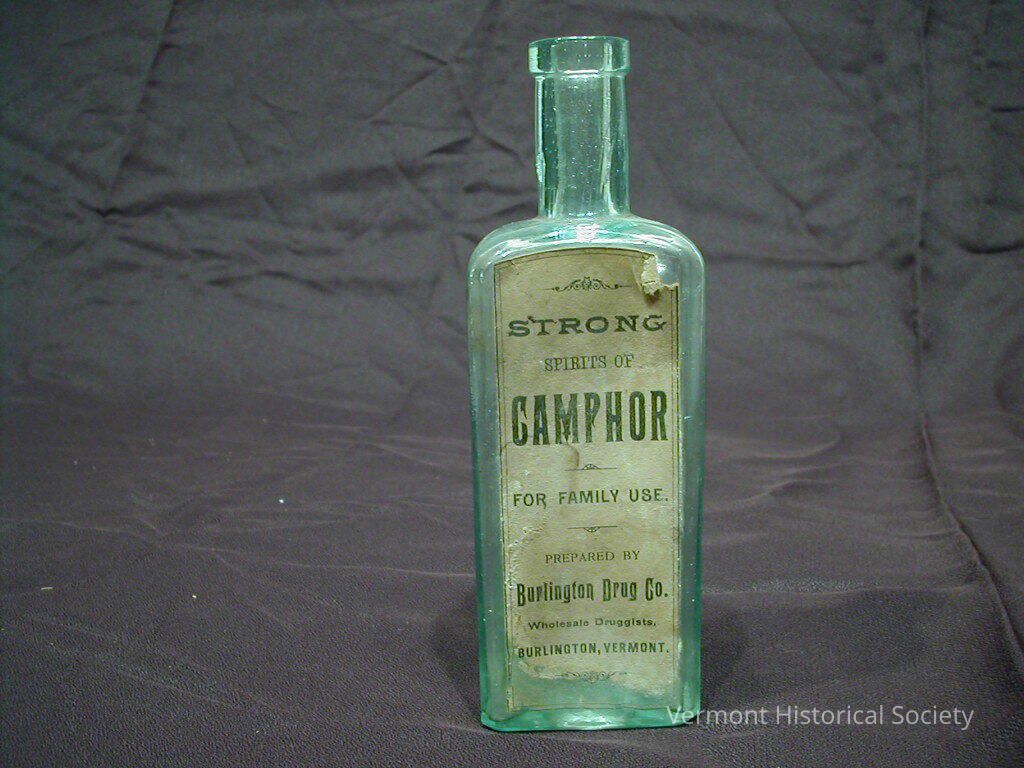 Rectangular green glass bottle with a paper label on one side that reads, "Strong spirits of Camphor for family used. Prepared by Burlington Drug Co. Wholesale Druggists, Burlington, Vermont.Context