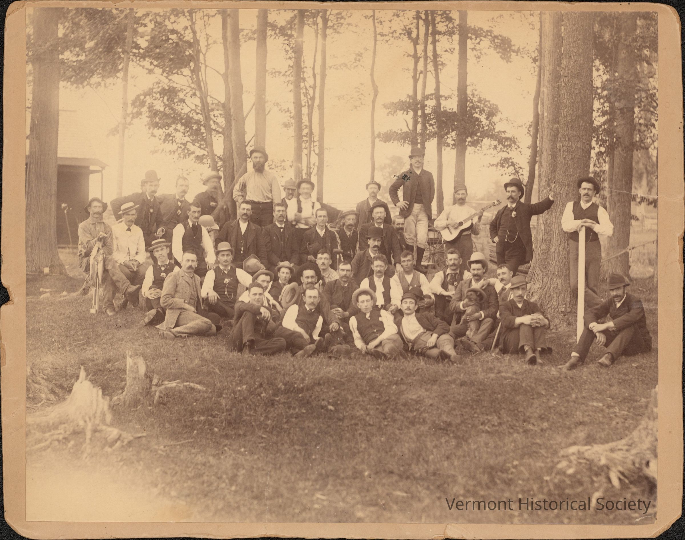 Sepia photograph of a group of people on a social outing in the woods.