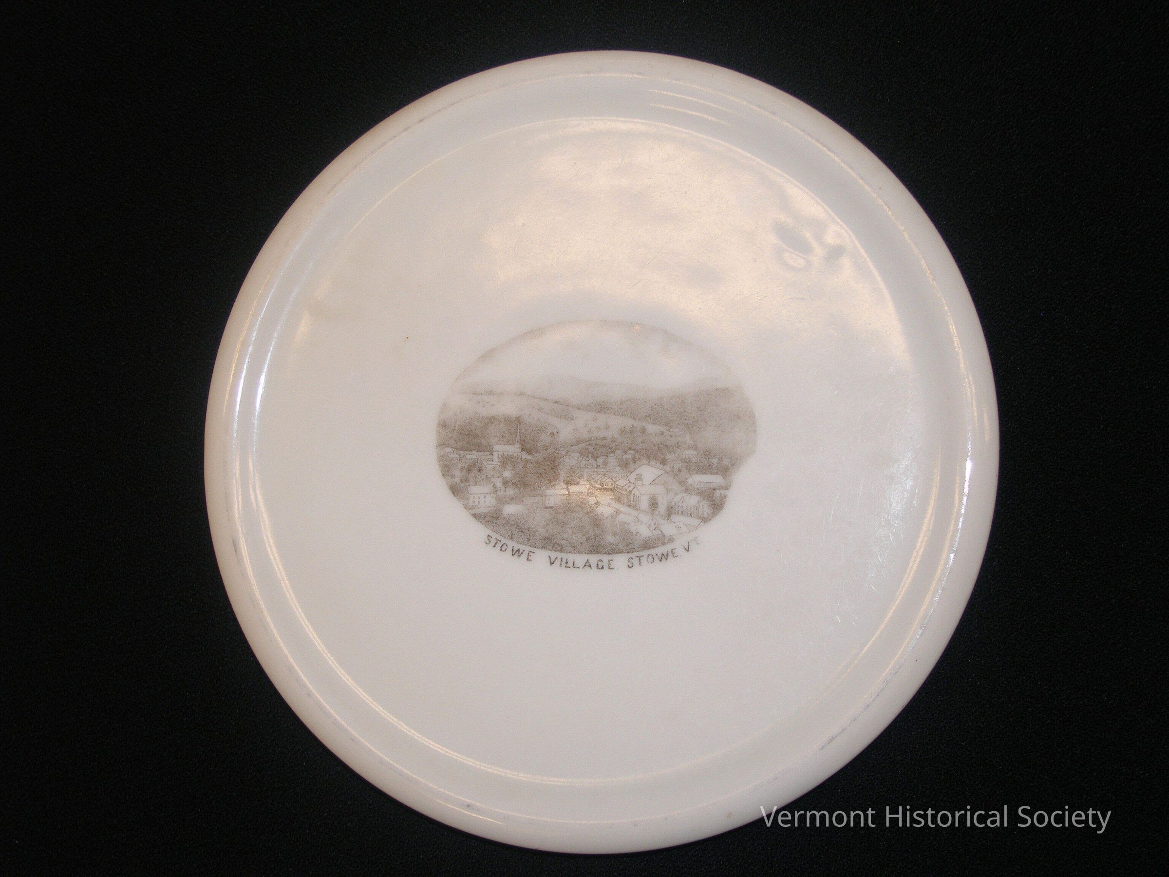 Round, white ceramic trivet with a slight, round rim. The trivet is printed in the center with an engraved illustration of an aerial view of a town. The image is labeled, "STOWE VILLAGE, STOWE, VT". The bottom of the dish is marked, "MADE IN GERMANY FOR WEYMOUTH BROWN & CO., BRISTOL, N.H."Acquisition