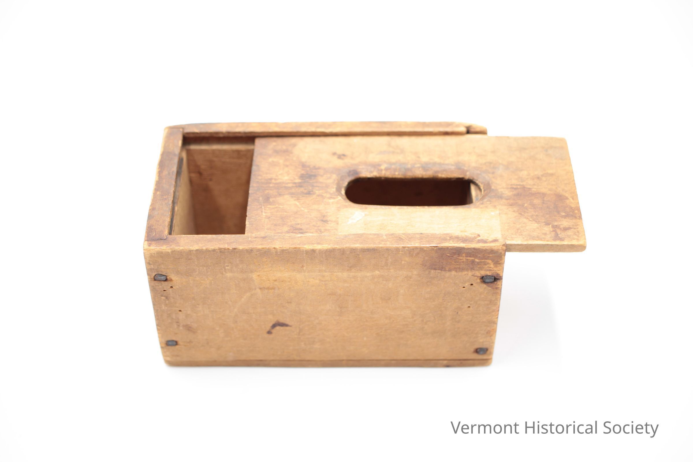 Small wooden ballot box. The box consists of two parts: a four-sided base and a slide-out top. One side of the base of the shorter than the rest, and the top slides through the gap and into a groove cut into the interior of the remaining three sides. There is a large slot in the center of the top piece, and a light rectangle where a label used to be.