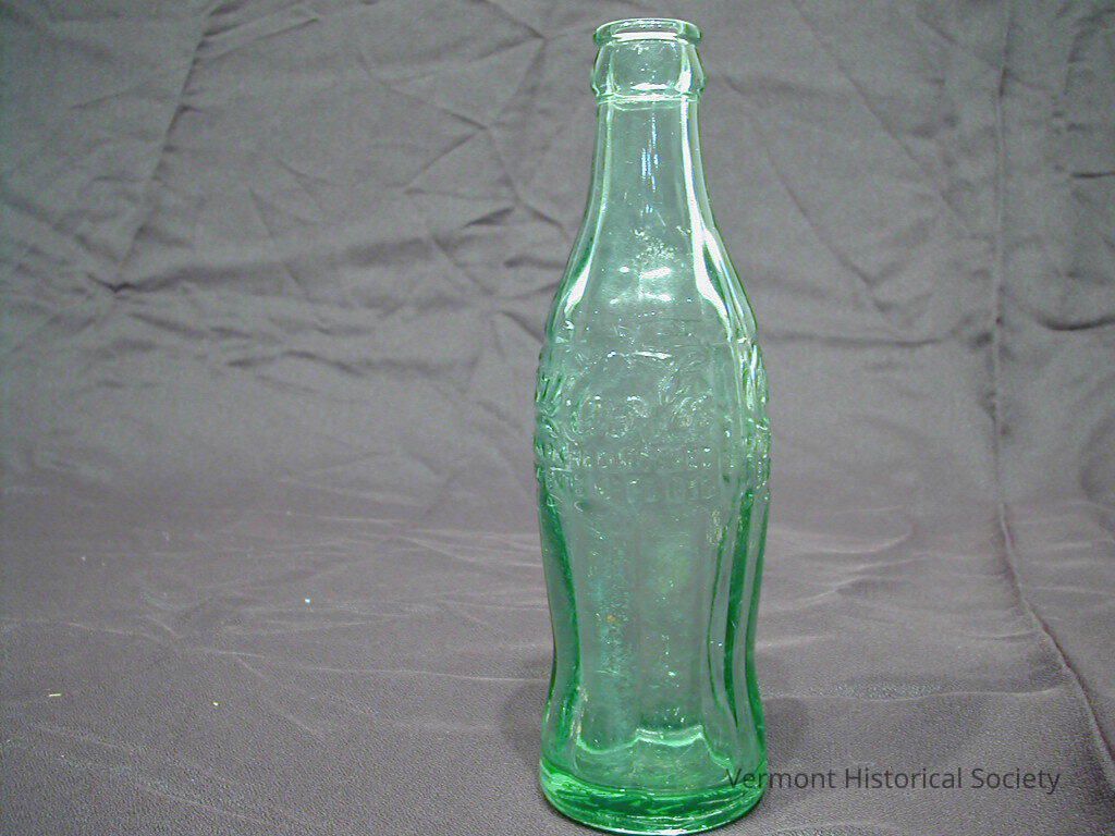 Green glass soda bottle with the molded inscription "Coca-Cola" around the middle.