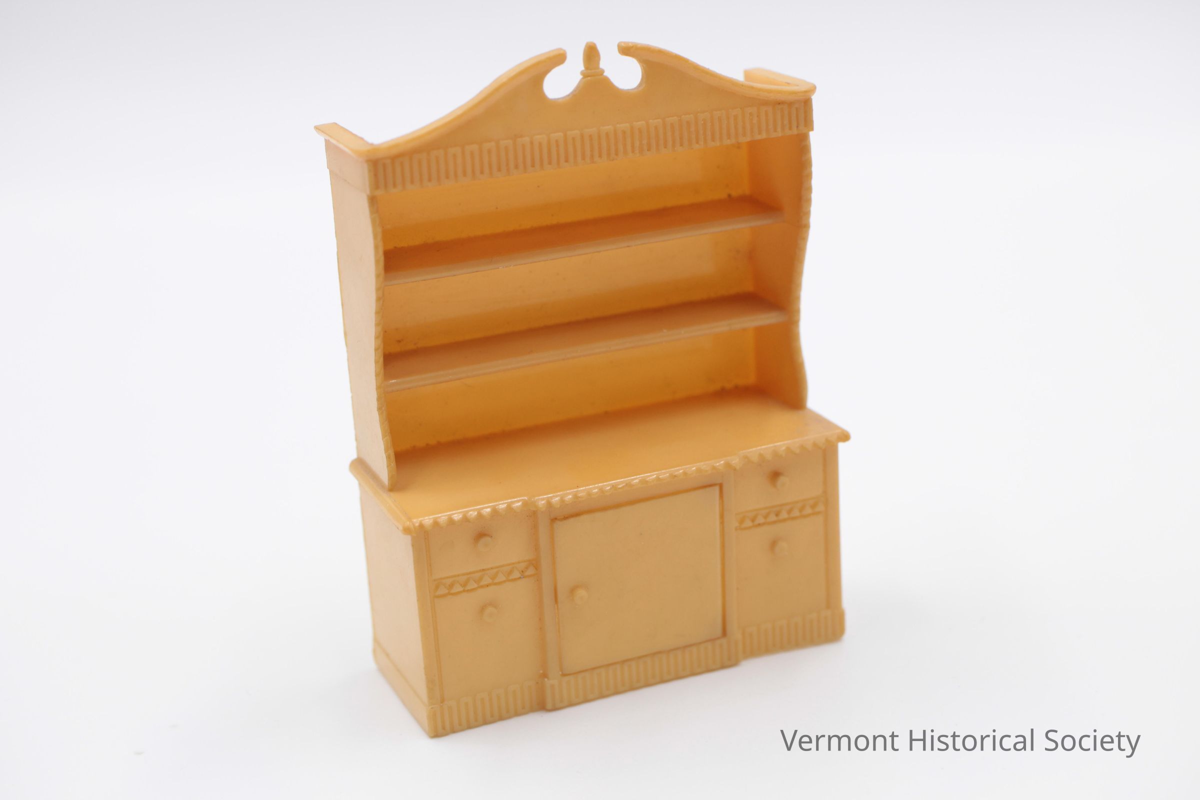 Yellow plastic dollhouse hutch consisting of a lower cabinet with upper shelves. The cabinet is molded with four drawers and one door; only the door opens. The top has two shelves. The hutch is left hollow. The back of the functional door is molded with the words, "D. 52 K. 62 A RENWAL PRODUCT PAT. PEND. U.S.A. & CANADA MADE IN U.S.A."Context