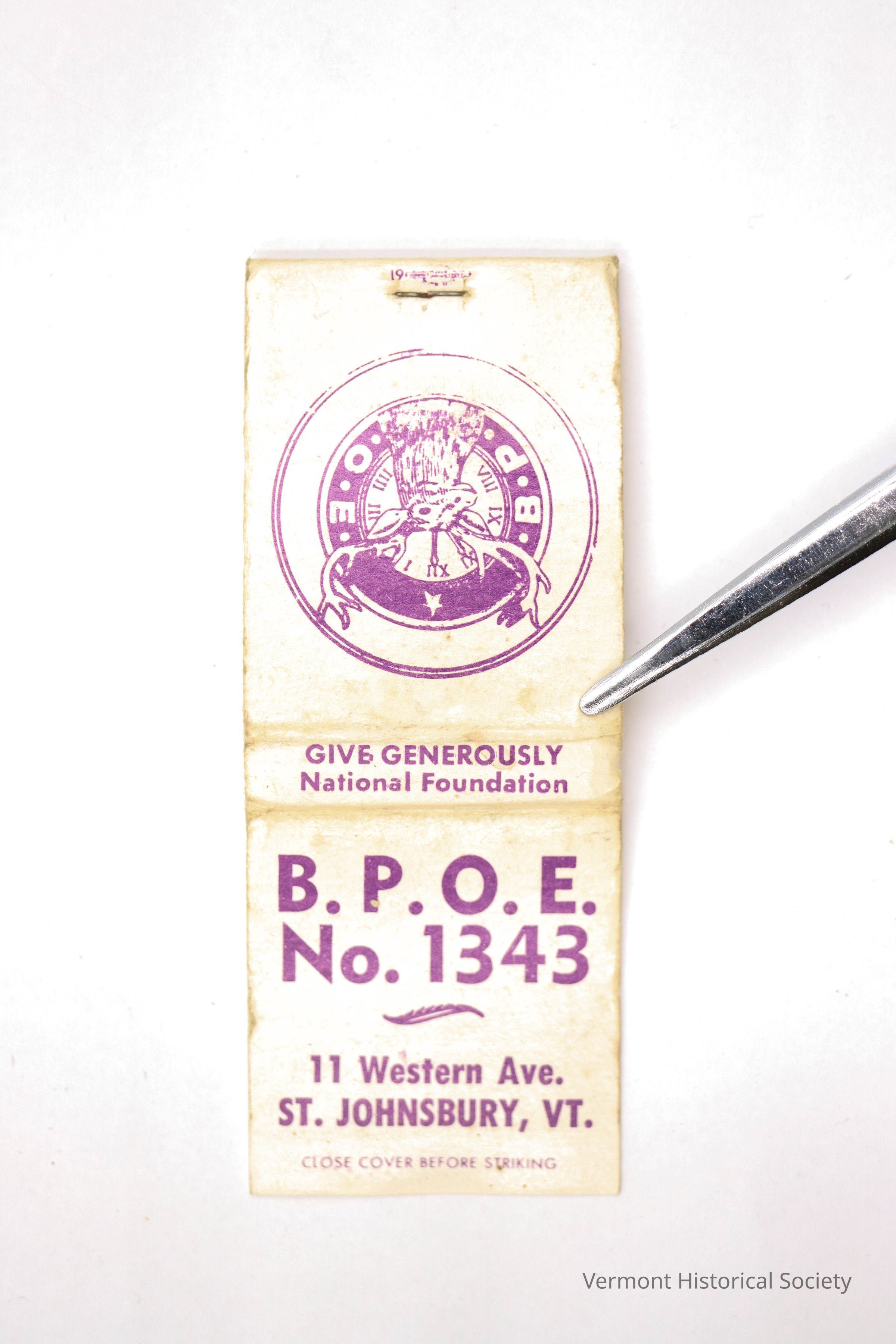 White cardboard bifold matchbook. The front flap is printed with the inscription, "B.P,O.E. No. 1343 / 11 Western Ave. ST. JOHNSBURY, VT."