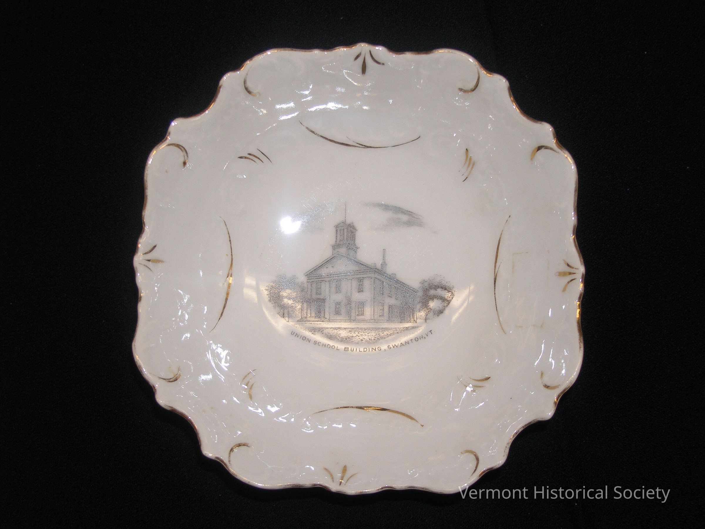 White ceramic bowl printed in the center with an engraved illustration of a neoclassical building with a central bell tower and four columns across the front. The image is labeled, "UNION SCHOOL BUILDING, SWANTON, VT." The bottom of the dish is marked, "MADE IN GERMANY WARNER & TOWNE SWANTON, VT."Context