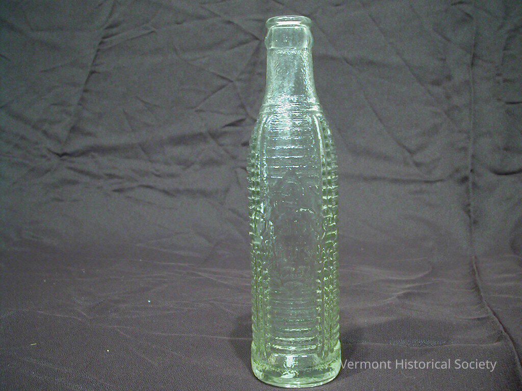 Round clear glass ribbed bottle with the molded inscription, "Orange Crush St. Johnsbury, Vt."