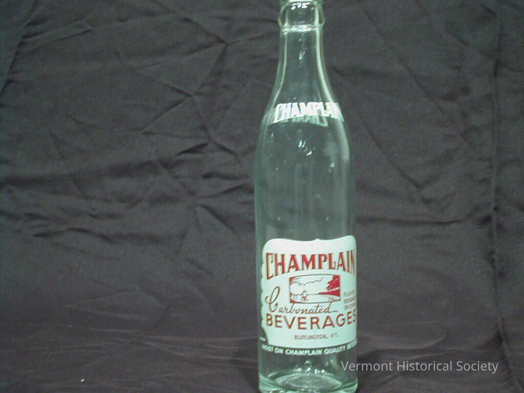 Clear glass bottle with the word, "CHAMPLAIN" printed twice on the neck, and a white, shield-shaped label with the red inscription, "Champlain Carbonated Beverages Burlington, VT."Context