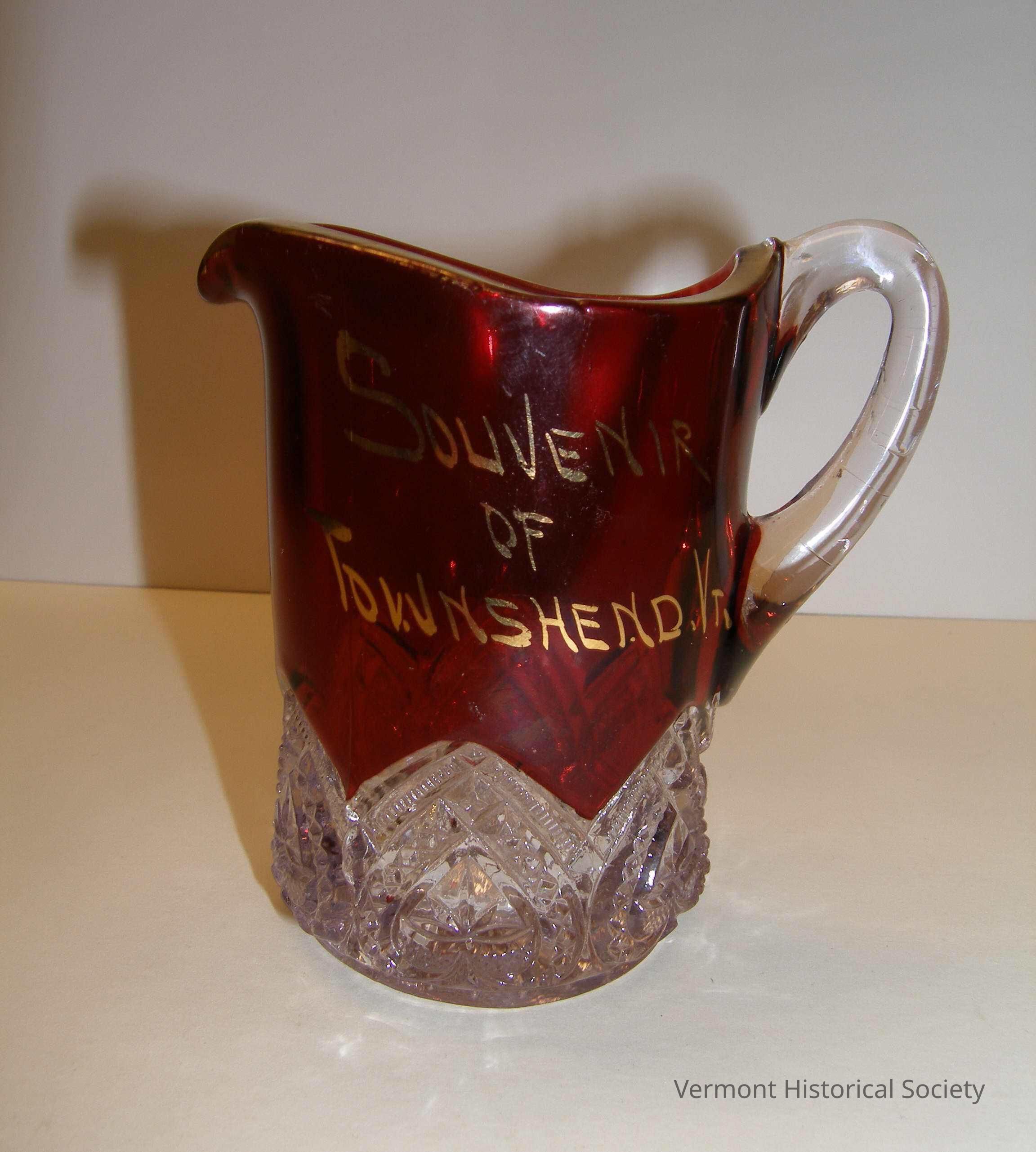 Molded glass cream pitcher. The handle and base of the pitcher are clear glass, and the base is molded into facets to imitate cut crystal. The upper portion of the pitcher is red glass and is painted with the inscription, "Souvenir of Townshend, Vt." in gold.