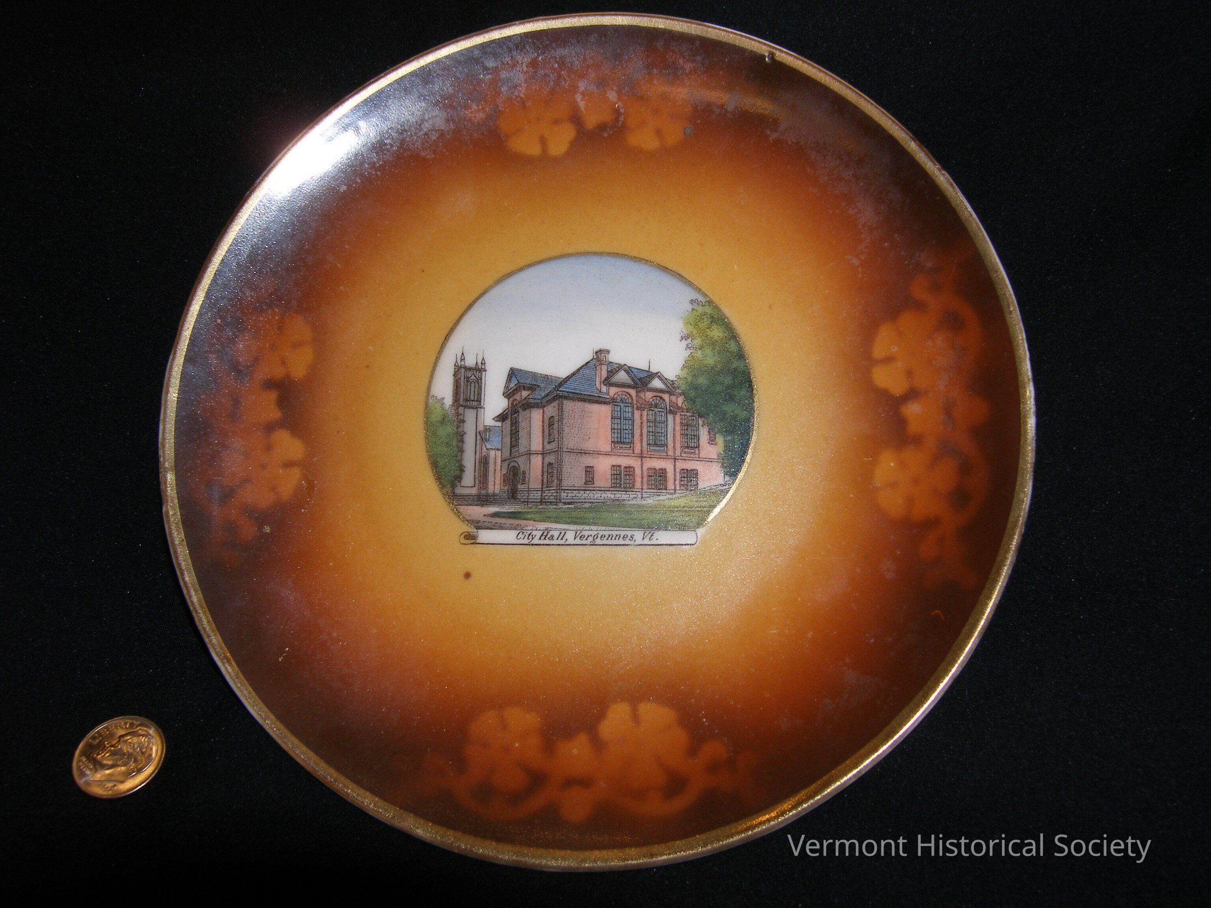 Ceramic saucer air brushed from dark brown (around the rim) to light yellow (center) with stenciled flowers. The center is printed with a full-color illustration of a large building with arched windows and gothic tower in front. The image is labeled, "City Hall, Vergennes, Vt." The bottom of the saucer is marked, "MW Co. Made in Germany for W. A. & W. B. Dalrymple, Vergennes, Vt."Context