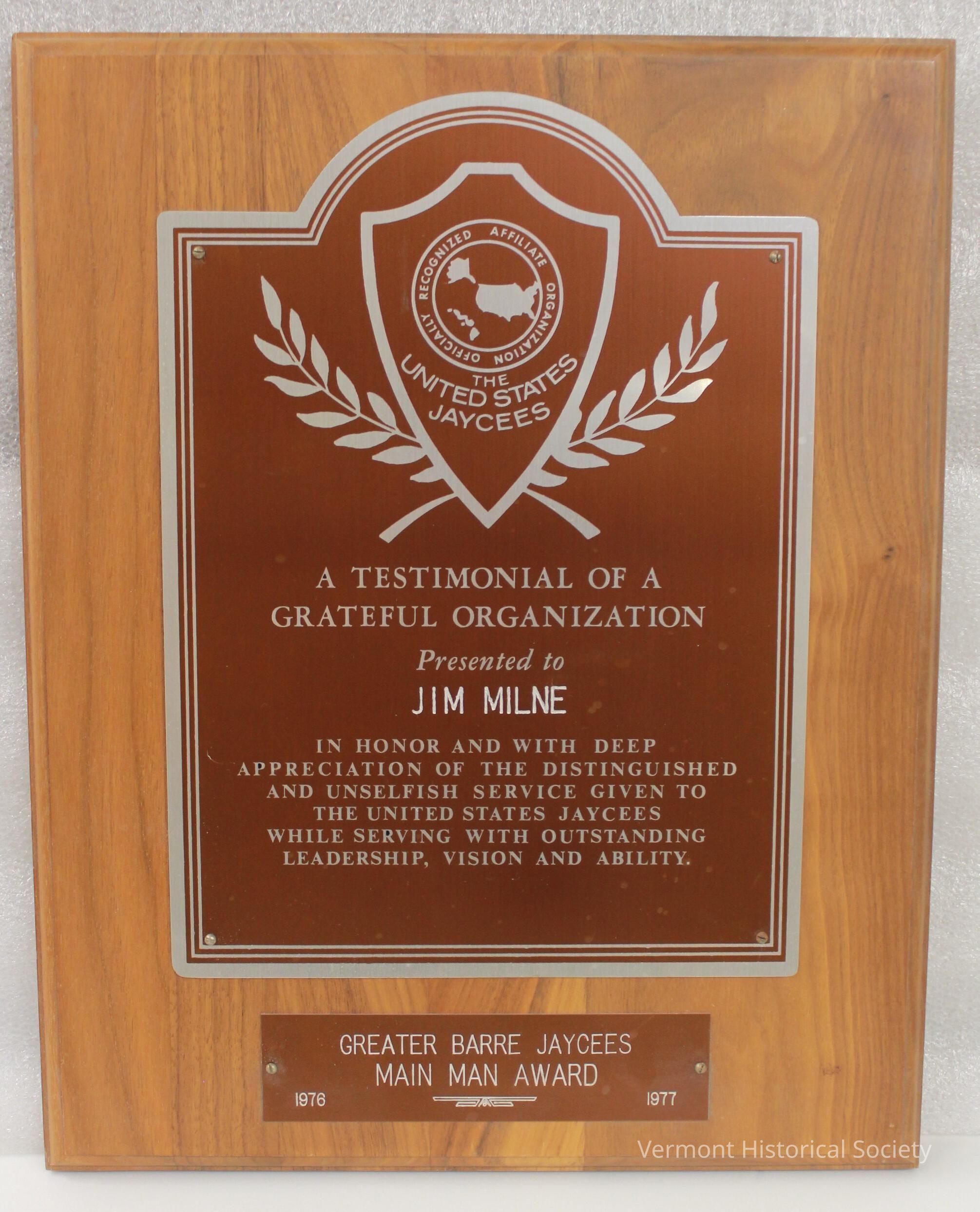 Metal plaque on a wooden board. The plaque is printed with an image of a shield over two laurel branches. Within the shield is a map of the United States of America encircled by the words, "OFFICIALLY RECOGNIZED AFFILIATE ORGANIZATION". The words "THE UNITED STATES JAYCEES" are within the shield beneath the map.