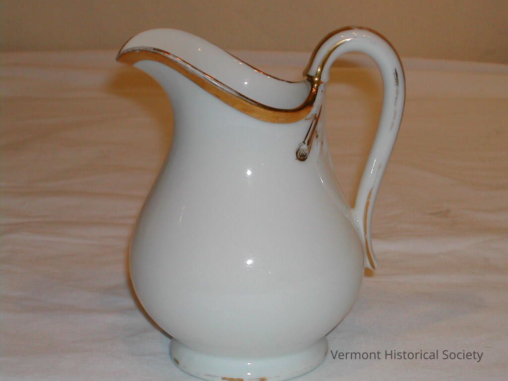 White-bodied ceramic cream pitcher with an ear-shaped handle. The rim and handle are gilded, and a leaf is drawn in gilding at the attachment of the handle.