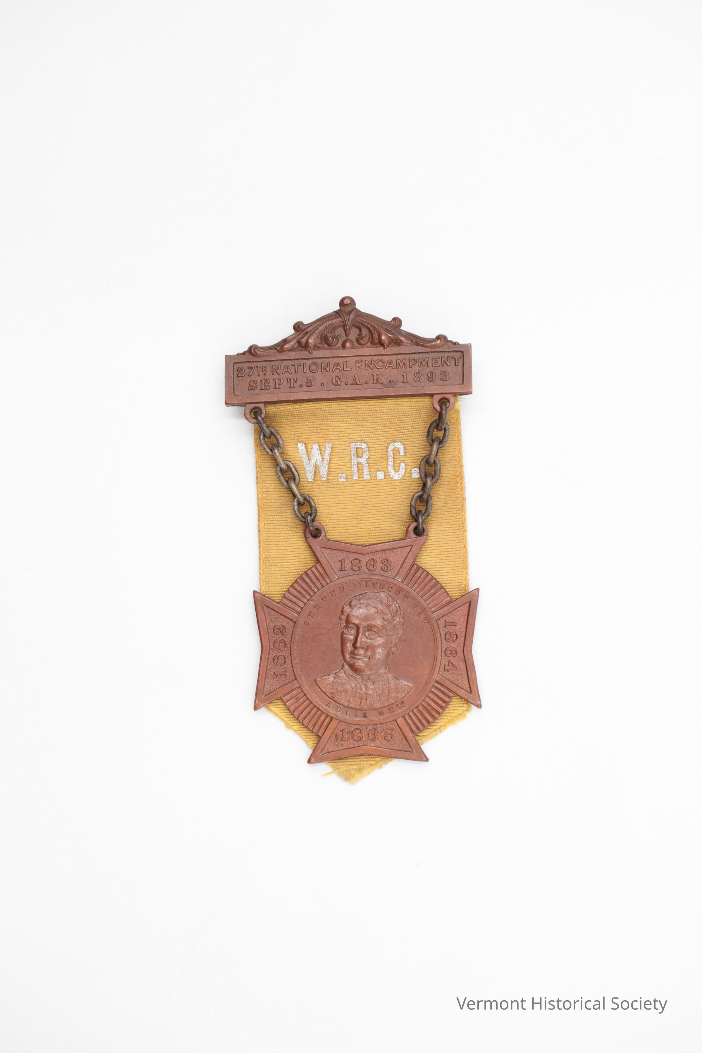 Membership ribbon consisting of a rectangular bar, a yellow ribbon, and a medallion in the shape of a Maltese cross. The bronze bar has decorative scrollwork and the inscription, "27th NATIONAL ENCAMPMENT SEPT. 5. G. A. R. 1893". There is a hinged pin on the reverse. A yellow grosgrain ribbon is looped and stitched onto a wire on the back and stamped with the initials W.R.C. in silver. A medallion hangs from two short chains connected to the bar. Each arm of the cross has a date: 1863, 1864, 1865, 1862. At the center is a bust of a woman wearing glasses and the inscription, "SERVED WITHOUT PAY ADLIA NEW". The back of the medallion reads, "SOUVENIR PRESENTED BY LADIES CITIZENS COMMITTEE INDIANAPOLIS".Context