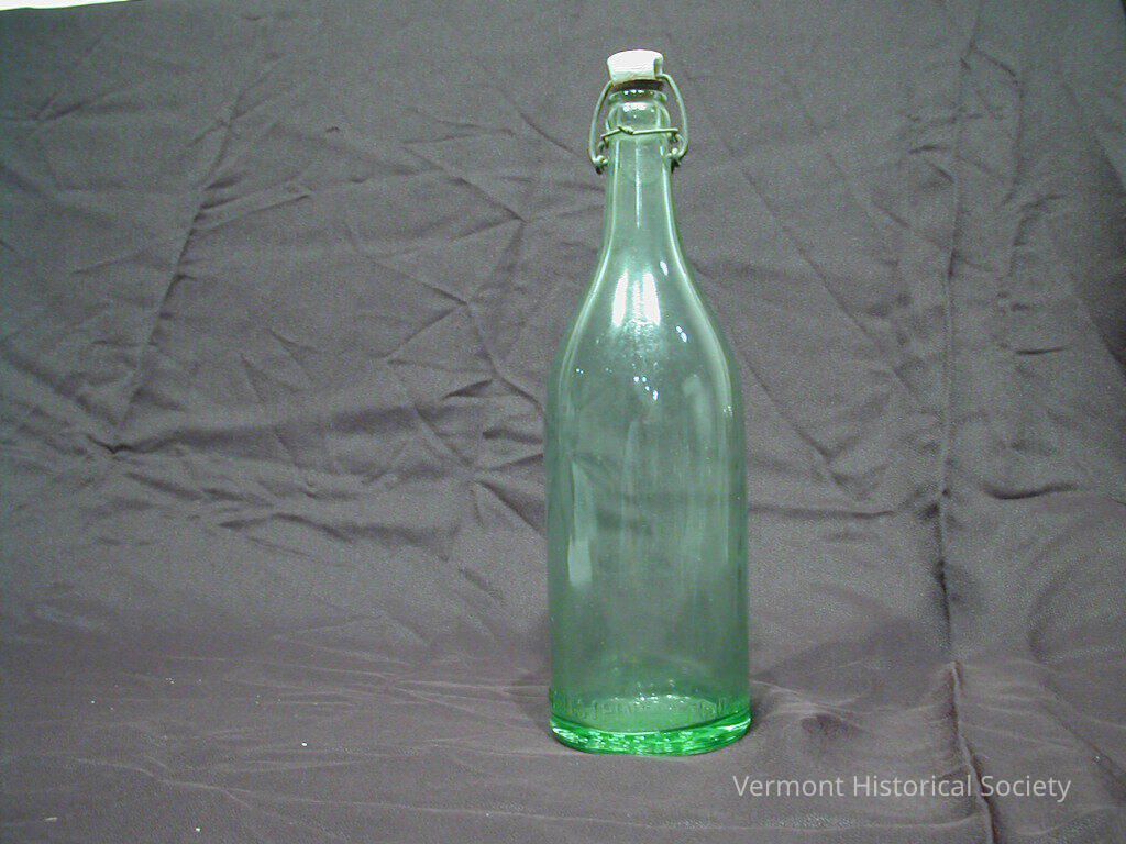 Green glass bottle with wired stopper and the molded inscription, "Green Mountain Spring Water Soda Co. Barre V.T." around the base.Context