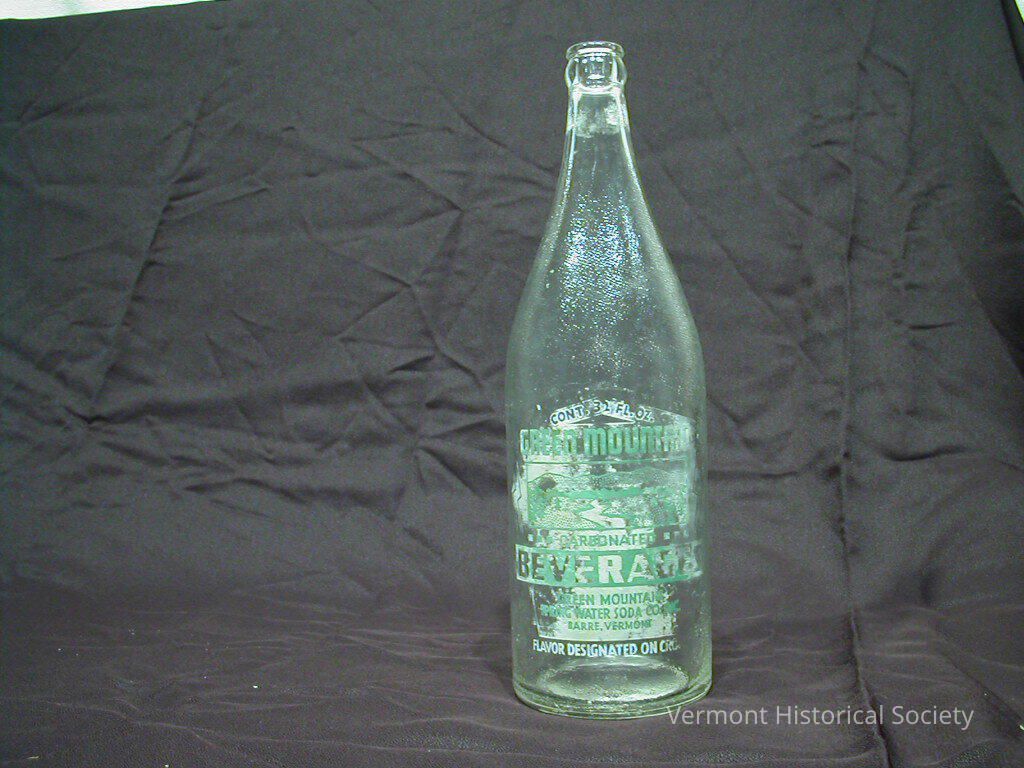 Quart-sized clear glass bottle with the green printed label, "GREEN MOUNTAIN CARBONATED BEVERAGES".Context