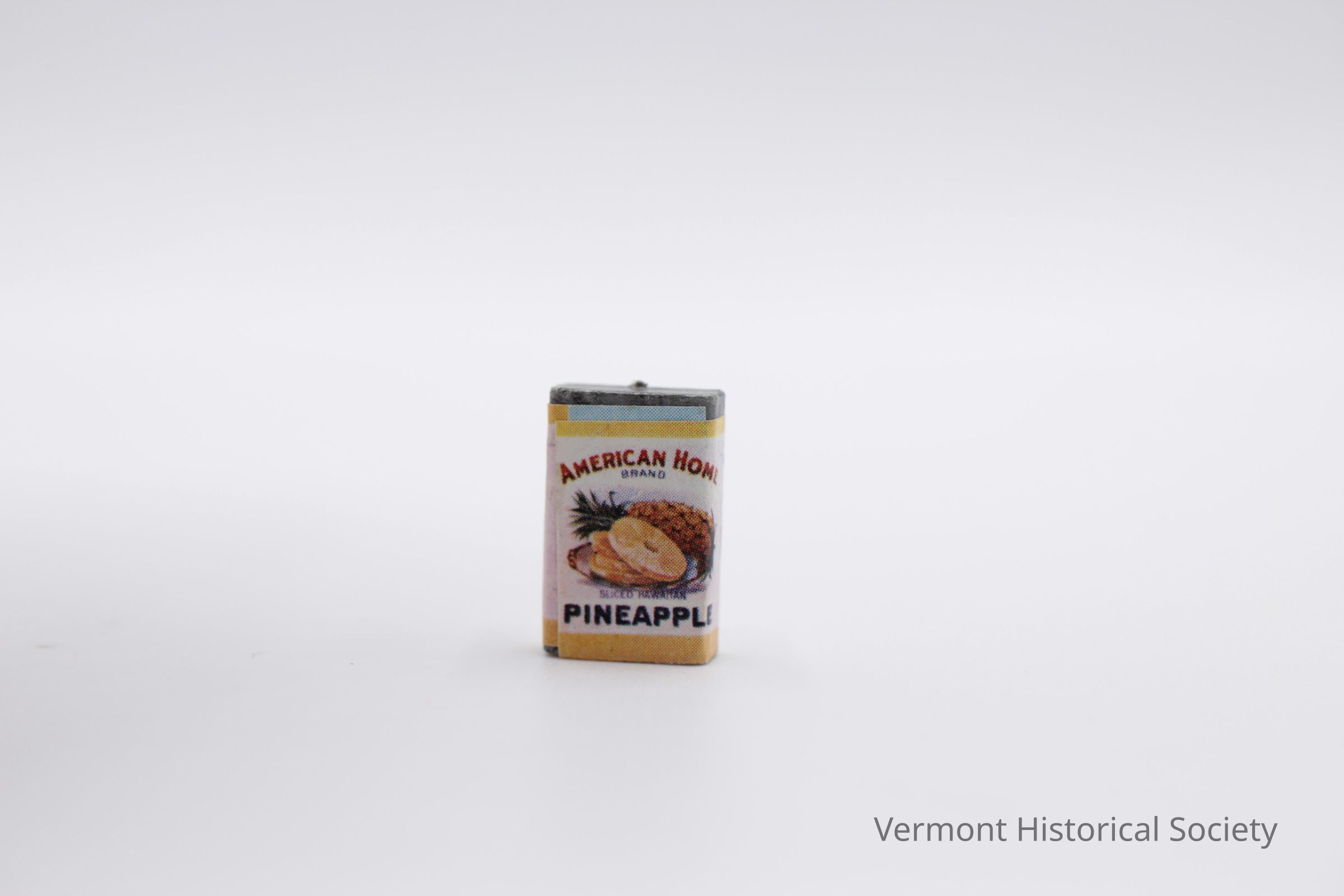 Miniature rectangular food-storage can. The can is made of silver-colored plastic wrapped with a paper label. One side of the label shows pineapple slices with a whole pineapple and the words, "AMERICAN HOME BRAND / PINEAPPLE". The other sides shows a two-story house with the label, "AMERICAN HOME BRAND GEO. RASMUSSEN CO. CHICAGO ILL."Context