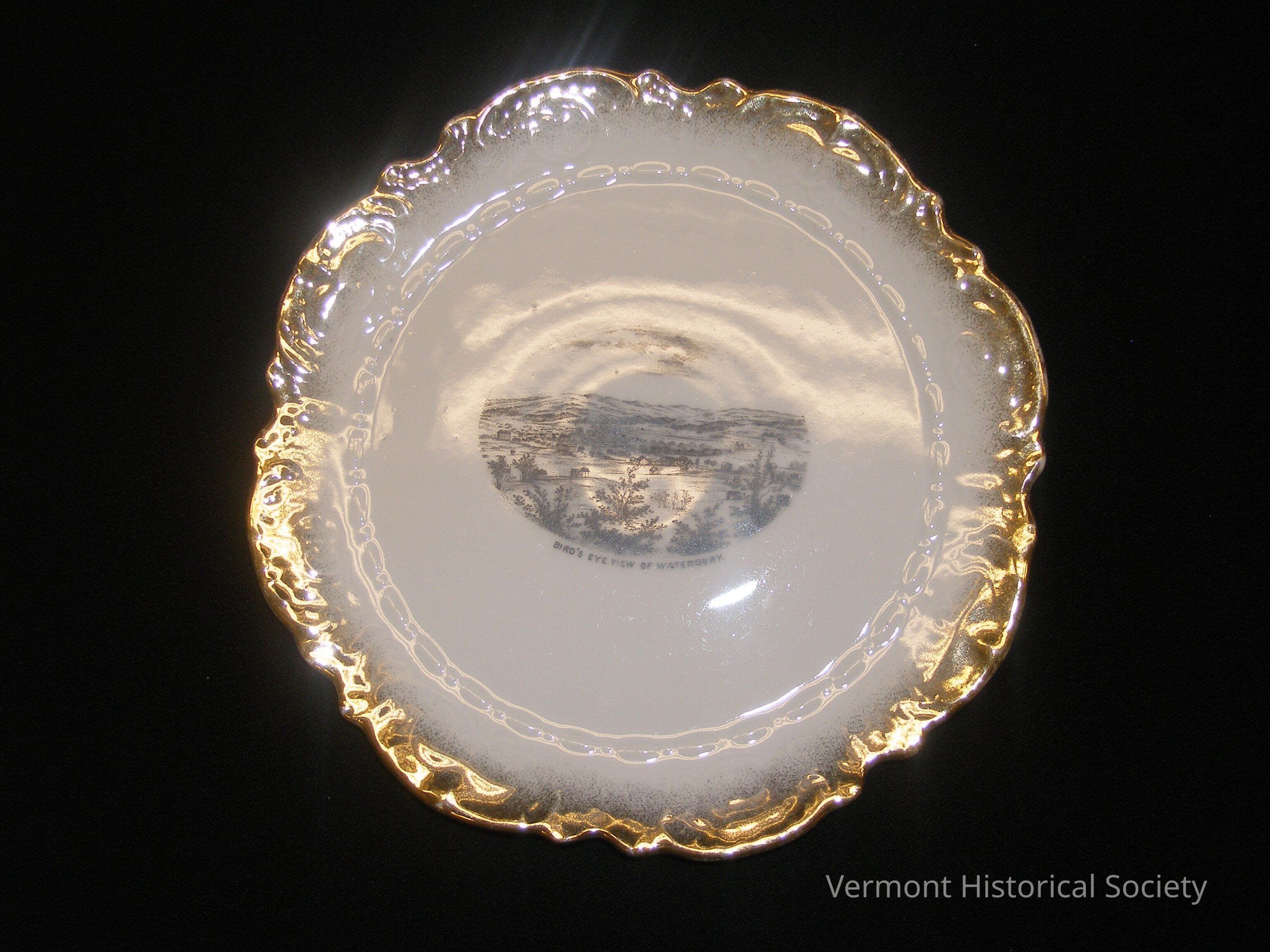 White ceramic plate with decoratively molded and gilded edge. The center is printed with an engraved illustration of an aerial view of a village in a wide valley with mountains in the background. The image is labeled, "BIRD'S EYE VIEW OF WATERBURY." The back of the plate is marked, "MADE IN GERMANY H. C. WHITEHILL WATERBURY, VT."Context