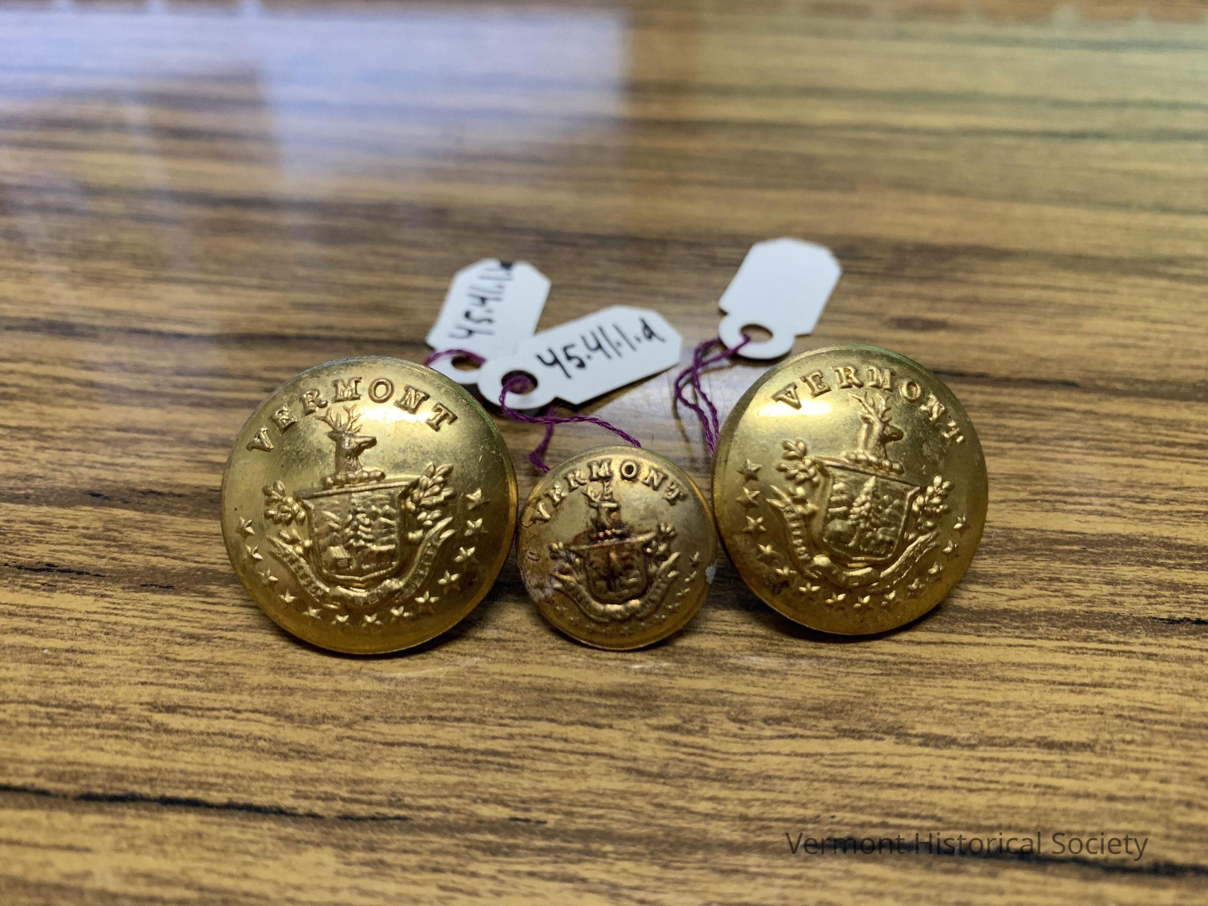 Three military buttons. They are two sizes of the same design, consisting of the Vermont state seal, motto ("Freedom & Unity"), the word "VERMONT", and 13 stars.Context