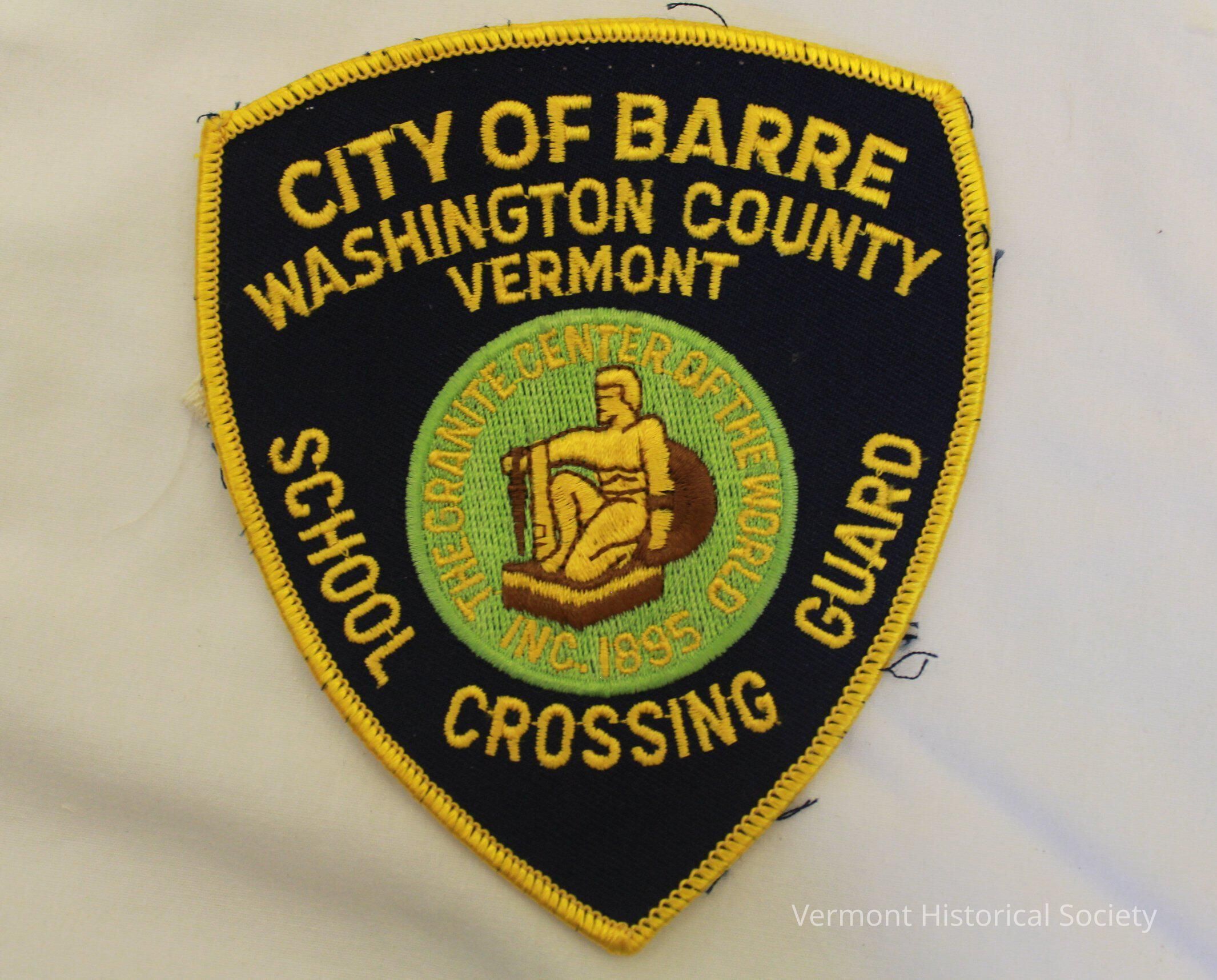 Navy blue, shield-shaped patch embroidered in yellow with the inscription, "CITY OF BARRE WASHINGTON COUNTY VERMONT SCHOOL CROSSING GUARD". At the center is a green embroidered circle with a brown-and-yellow image of a kneeling man (youth triumphant) with the inscription, "THE GRANITE CENTER OF THE WORLD INC. 1895".Context