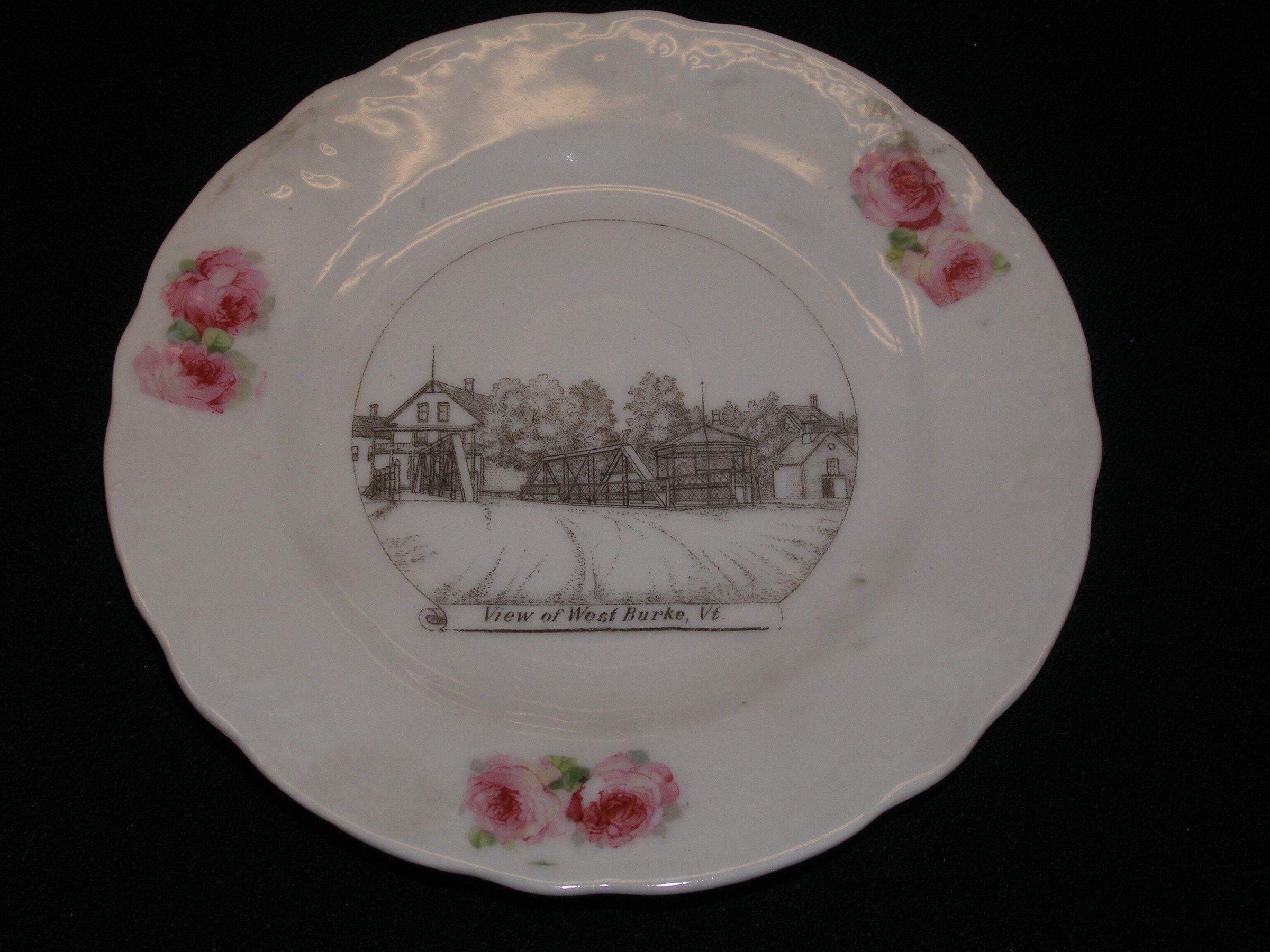 White ceramic saucer with pink roses printed in three places on the rim. The center is printed with an engraved illustration of a metal bridge with village buildings behind. The image is labeled, "View of West Burke, Vt." The back of the saucer is marked, "WHEELOCK Made in Germany for H. S. Chappell, West Burke, Vt."Context