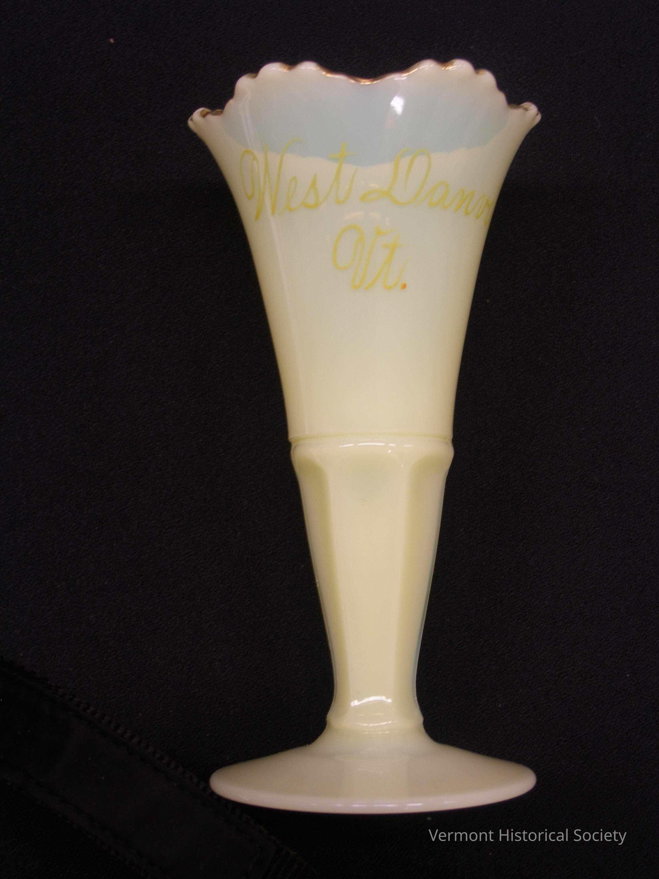 Custard glass fluted vase. The vase has a round base and flares outward toward the top. One side has the yellow, hand-painted inscription, "West Danville, Vt."
