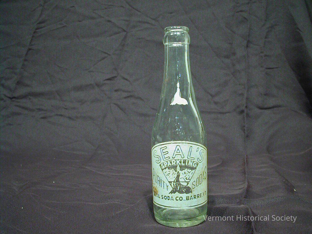 Clear glass bottle with a white printed label showing a seal balancing a bottle on its nose and the inscription, "SEAL'S SPARKLING PURITY SODAS SEAL SODA CO., BARRE, V.T."Context