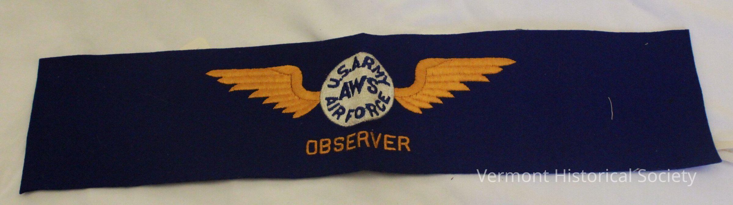 Blue wool felt armband embroidered with a white circle with yellow wings. The circle has the blue inscription, "U.S.ARMY AWS AIR FORCE". Beneath the image is the word, "OBSERVER".