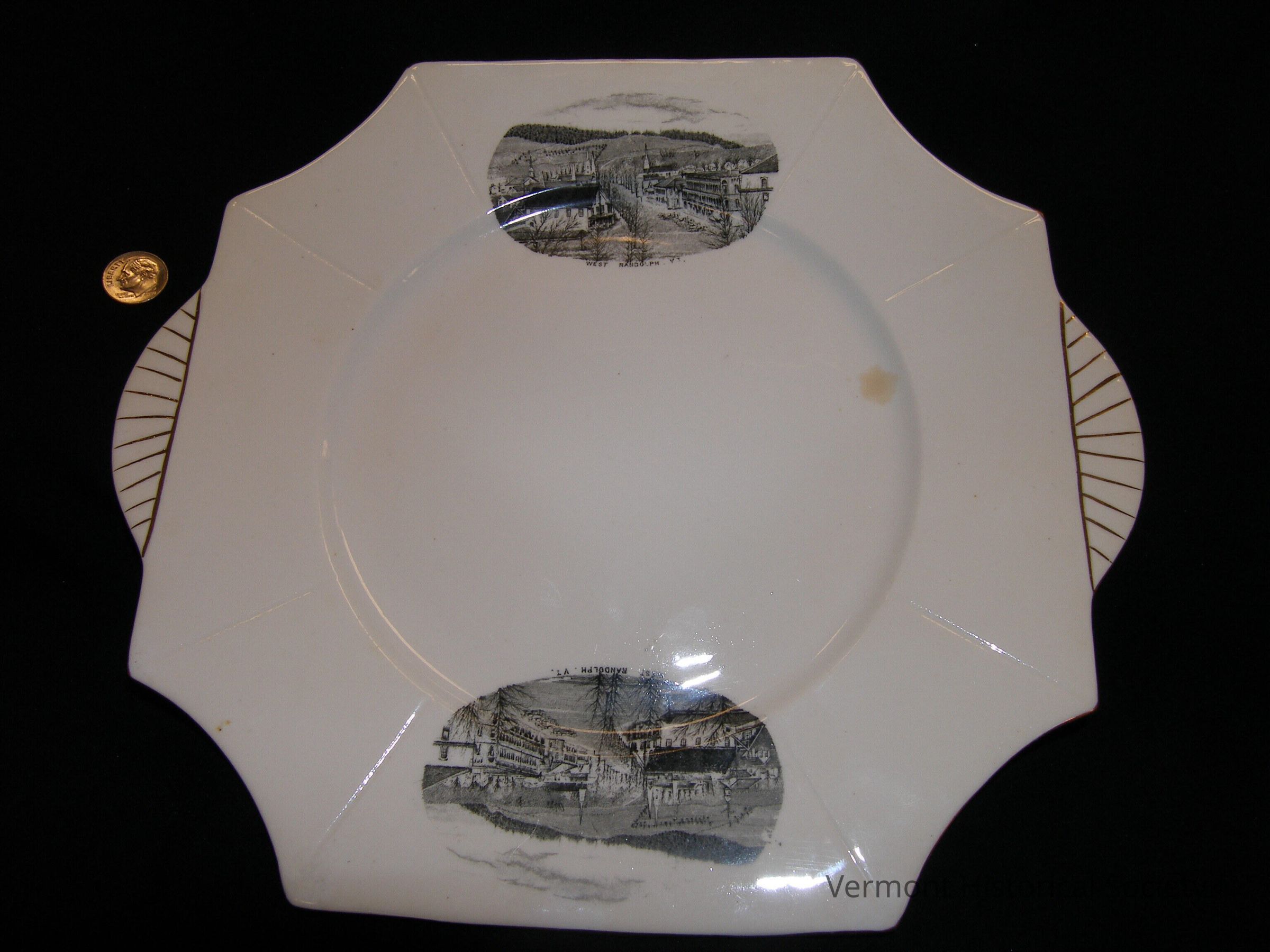 White ceramic decorative plate. The plate is square with concave corners. Two of the corners have semi-circular additions. There are two oval images printed on the rim at the flat edges. Both images show the same scene, but are oriented in opposite directions. The images show a town main street, lined with churches, commercial buildings, and residential buildings. The images are labeled, "WEST RANDOLPH, VT." The reverse of the plate is labeled, "Made in England, W. E. Lamson, West Randolph."Context