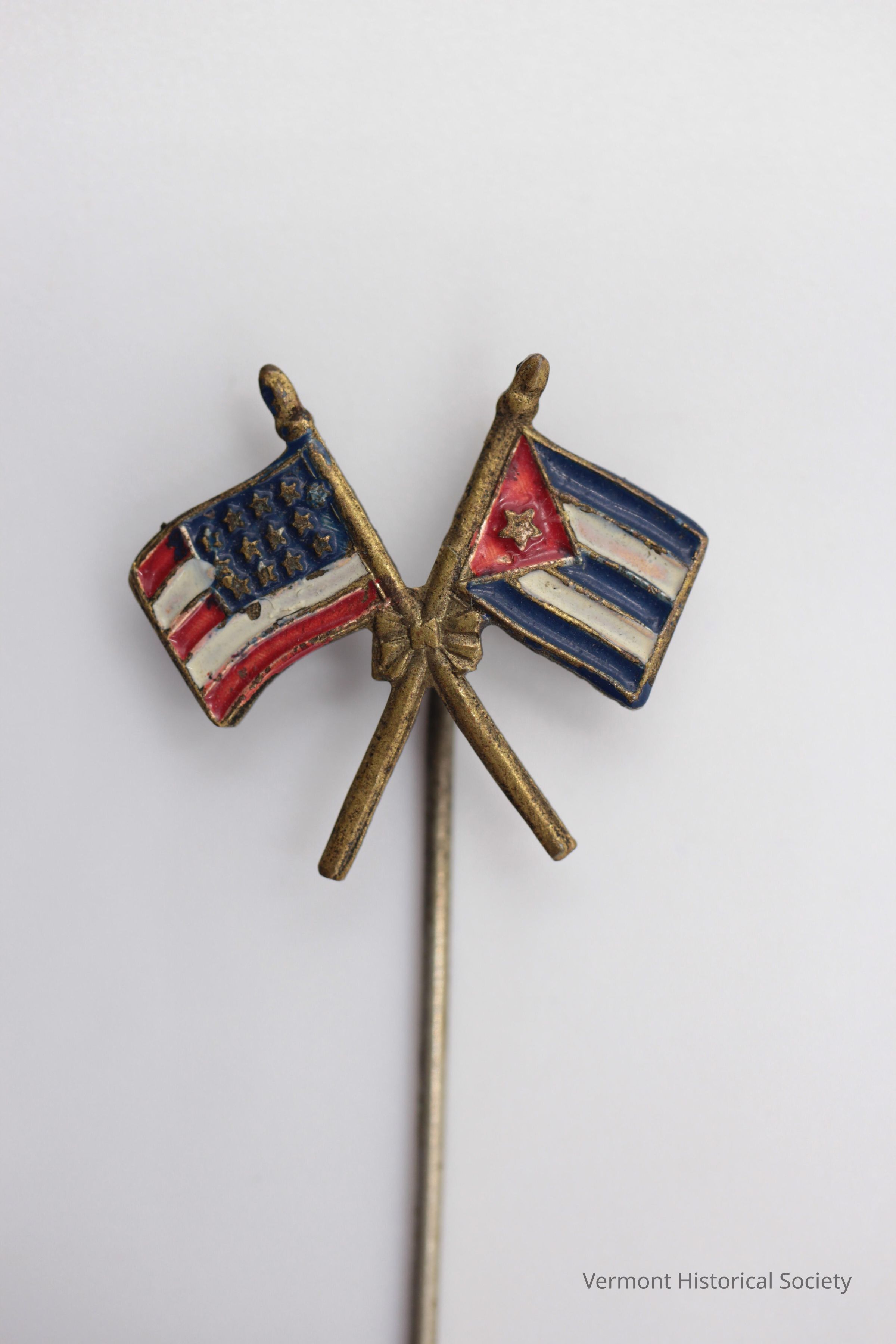 Stickpin showing crossed United States and Cuban flags. The flags are enameled red, white, and blue.