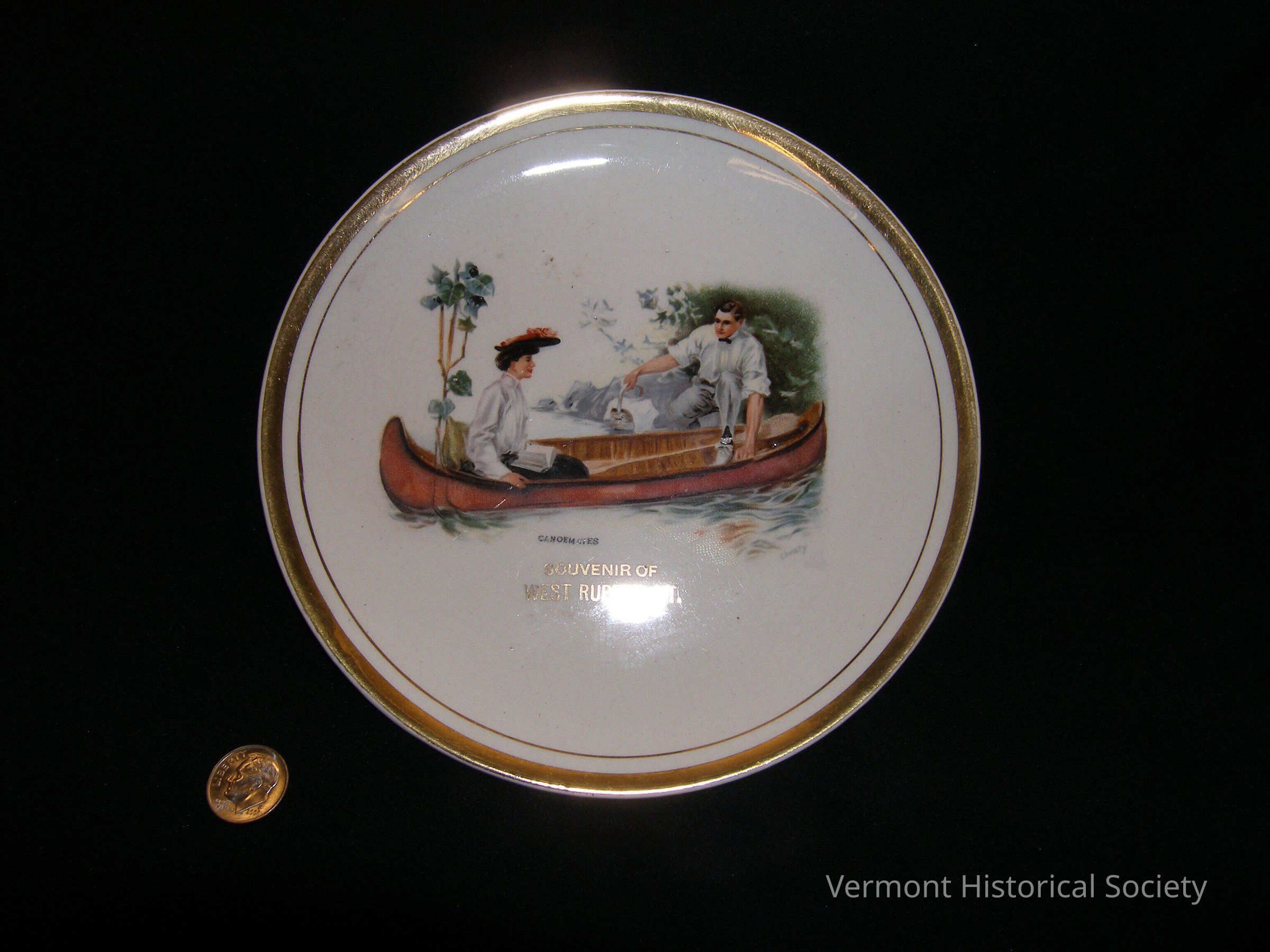 White ceramic plate with gilded edge printed in the center with a full-color illustration of a man and woman in a canoe. Beneath the image is the inscription, "SOUVENIR OF WEST RUPERT, Vt." The back of the plate is marked, "DRESDEN CHINA".