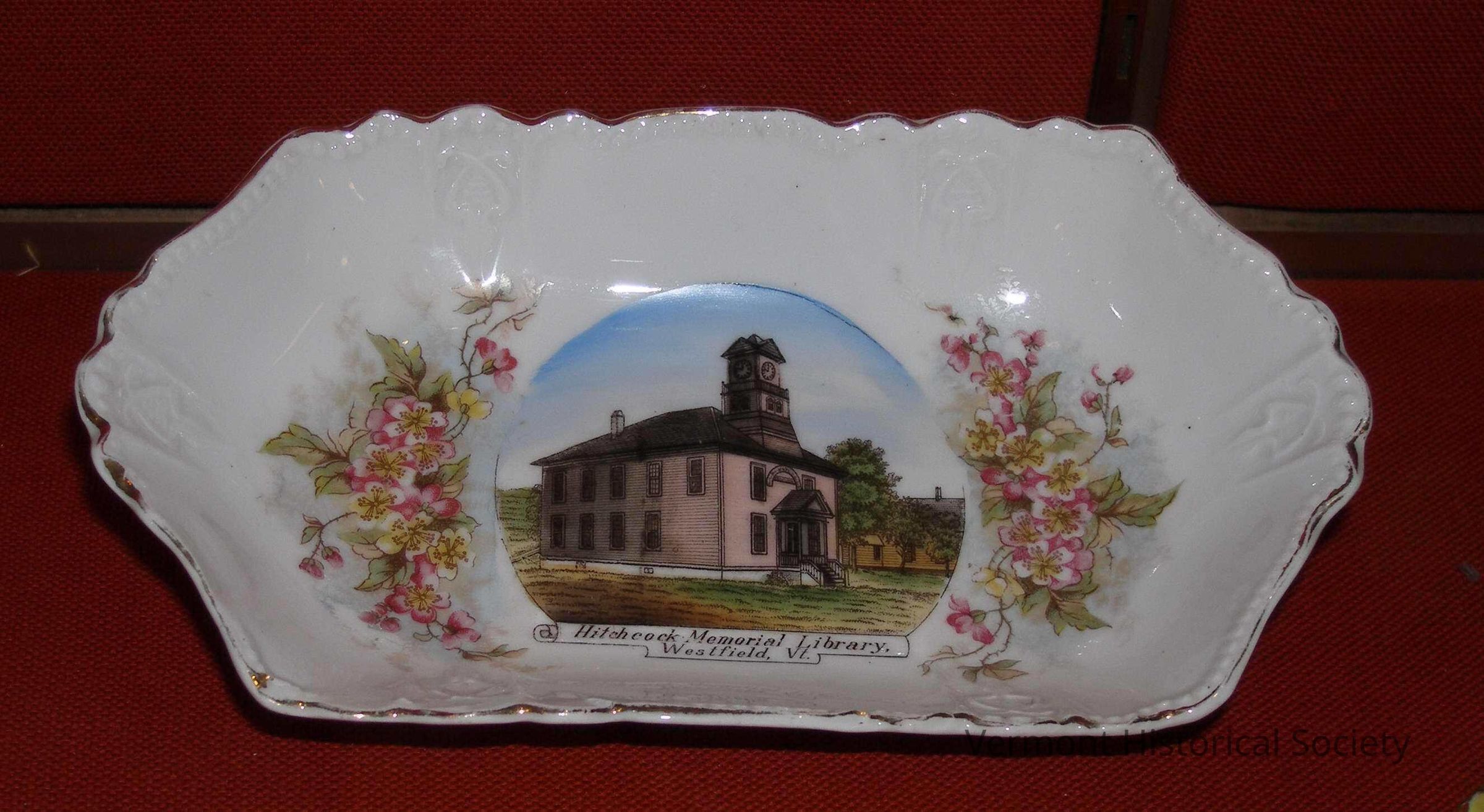 Small six-sided tray. The tray is printed on the bottom with sprays of pink and yellow flowers flanking a full-color illustration of a large, brick building with a clocktower at the center front. The image is labeled, "Hitchcock Memorial Library, Westfield, Vt." The bottom of the dish is marked, "H. B. HITCHCOCK, Westfield, Vt."Context