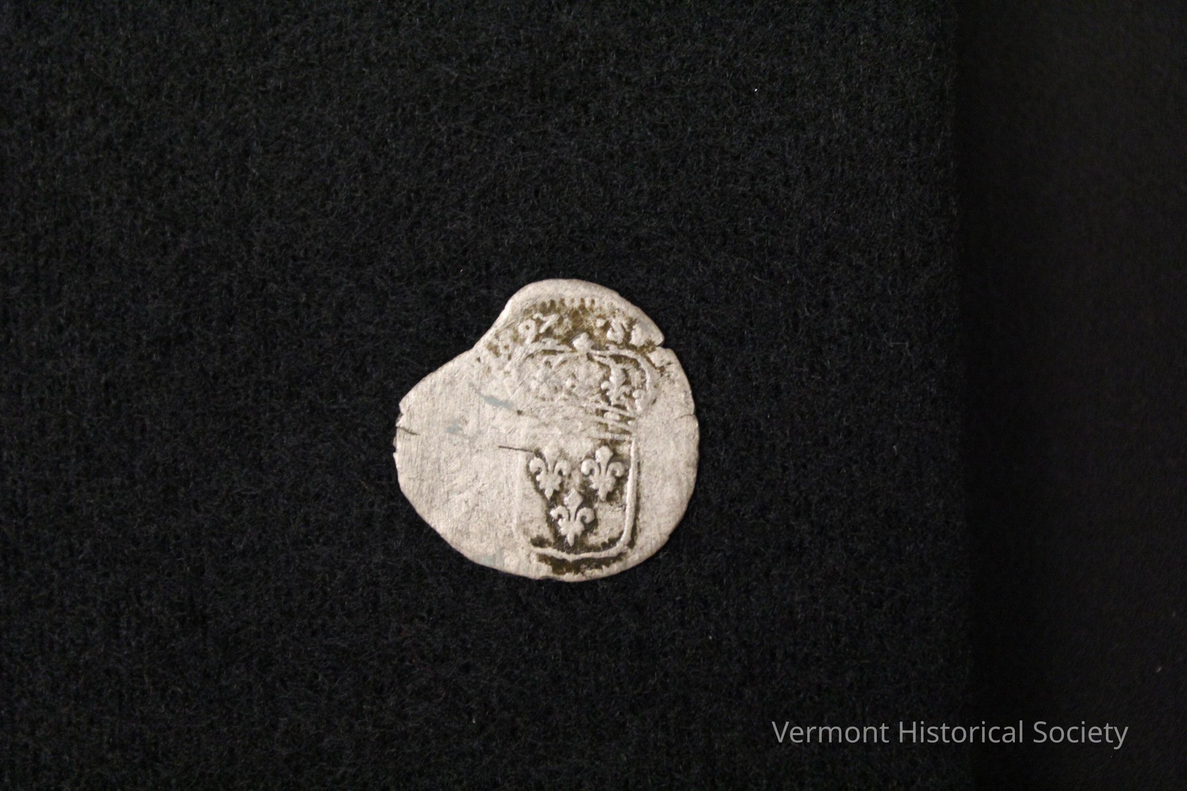 Small, misshapen silver coin. One side is stamped with the inscription "1697 [illeg]" along with a shield bearing three fleurs-de-lis under a crown. The other side is stamped with a cross-shape formed of Roman numeral twos (II) placed around a circle. An additional striking of a fleur-de-lis covers one of the cross' points.
