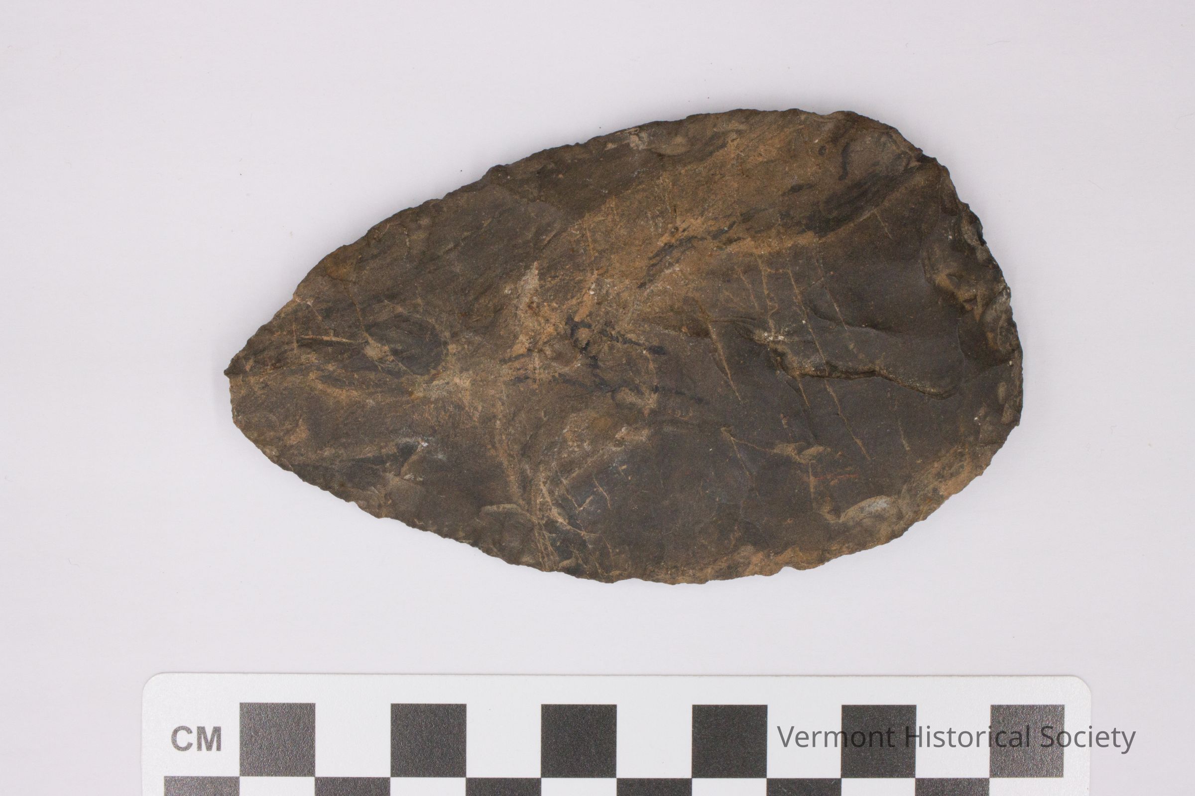 Miscellaneous chipped stone. It has an ovate shape with one rounded edge and one pointed edge.Context