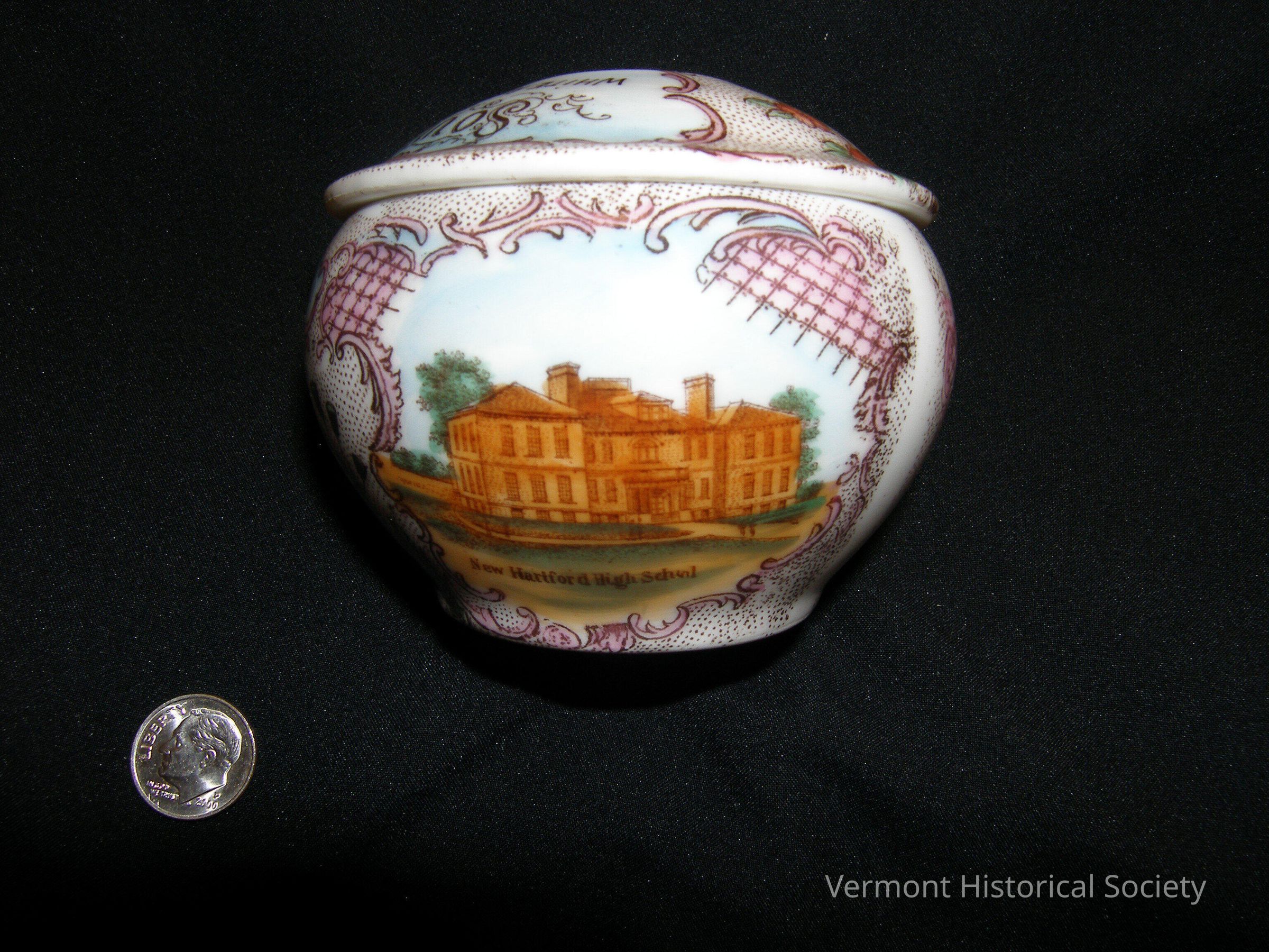 Two-piece hair receiver consisting of a small pot or jar and lid. The lid has a round hole in the center. The jar is printed with three images of buildings. The images are labeled, "New Hartford High School", "Gates Building" and "the Wilder Club and Library". The lid is labeled, "Souvenir of WHITE RIVER JUNC, VT."Use