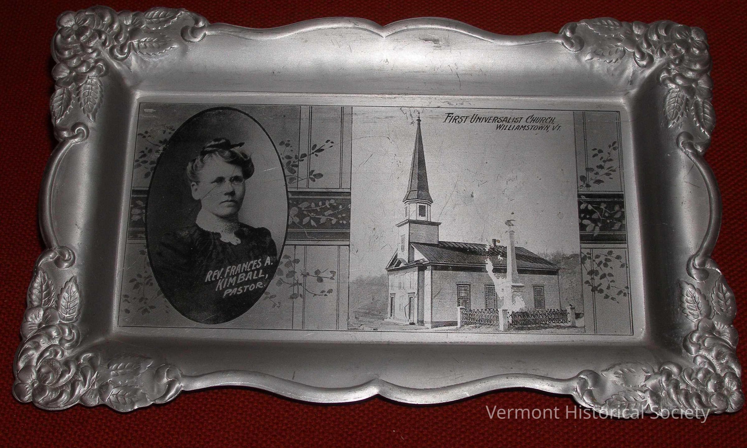 Rectangular stamped metal tray etched in the center with a photographic bust portrait of a woman and a church. The portrait is labeled, "REV. FRANCES A. KIMBALL, PASTOR" and the image of the church is labeled, "First Universalist Church Williamstown, VT." The bottom of the tray is marked, "NEW METHOD CO. MONEY RAISING PLANS FOR CHURCH WORKERS CHICAGO, U. S. A."Context