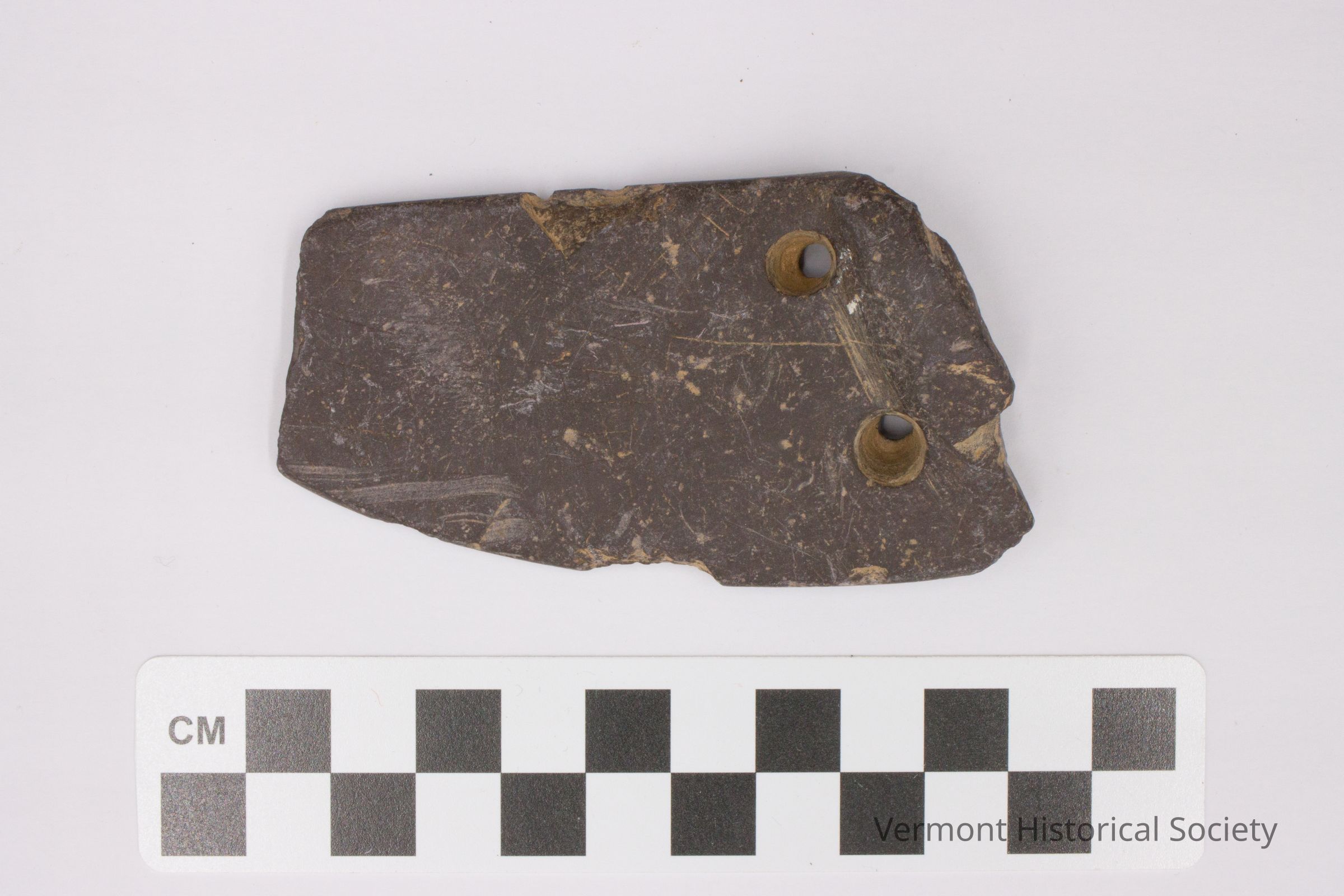 Ground stone atlatl weight. It is completely ground and polished. It consists of a single wing and is broken along the central hole. There are two holes drilled near the break, possibly as a repair attempt. There is incised line decoration on one face.Use