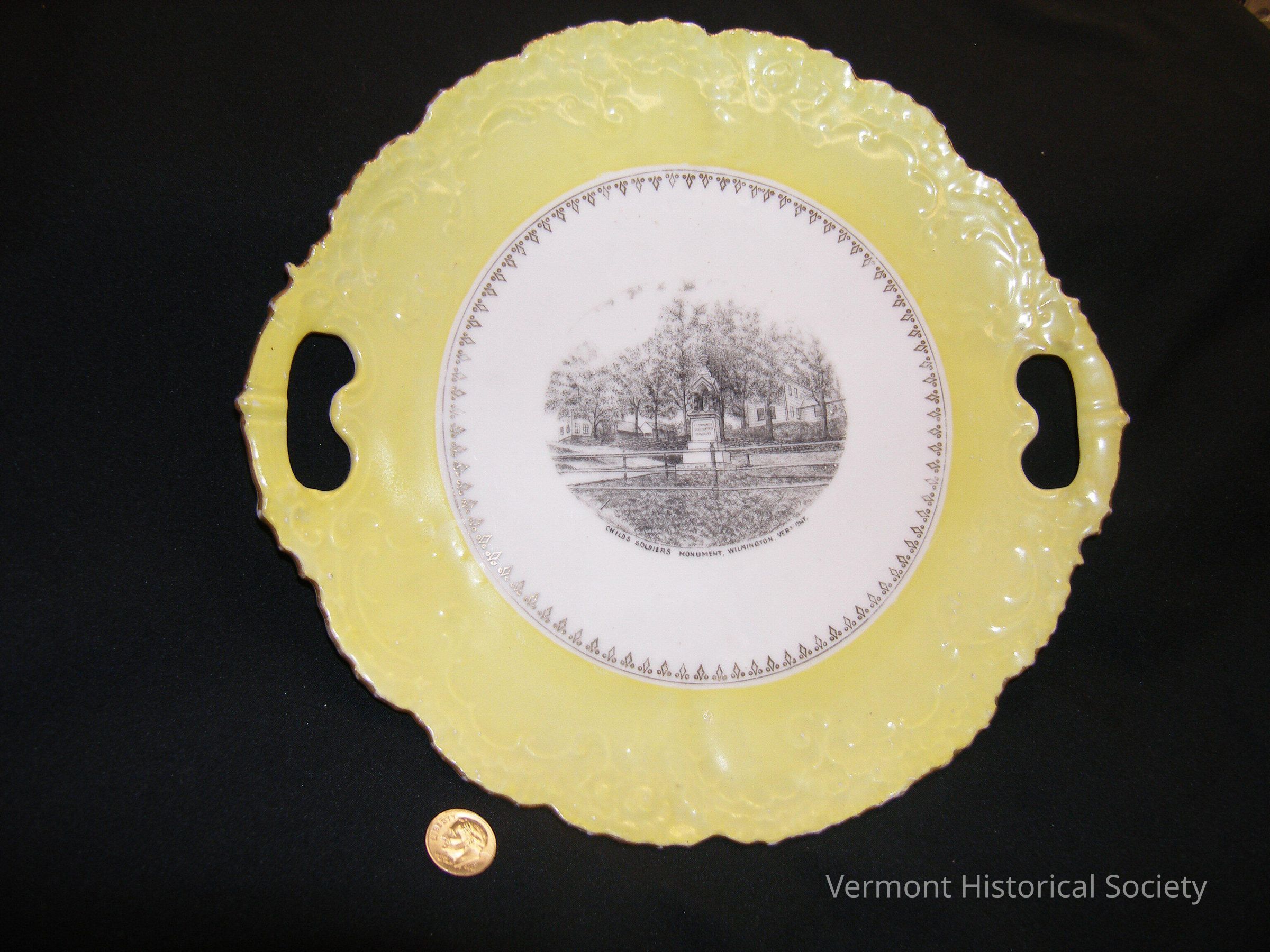 Decorative plate with a wide yellow rim with two pierced handles. The center is printed with an engraved image of a fenced-in park with a monument. The monument is a pillared roof on a square plinth. The image is labeled, "CHILDS SOLDIERS MONUMENT, WILMINGTON, VERMONT." The back of the plate is labeled, "B. F. H. S. China MADE IN AUSTRIA for C. D. Spencer & Co. Wilmington, Vt."Context